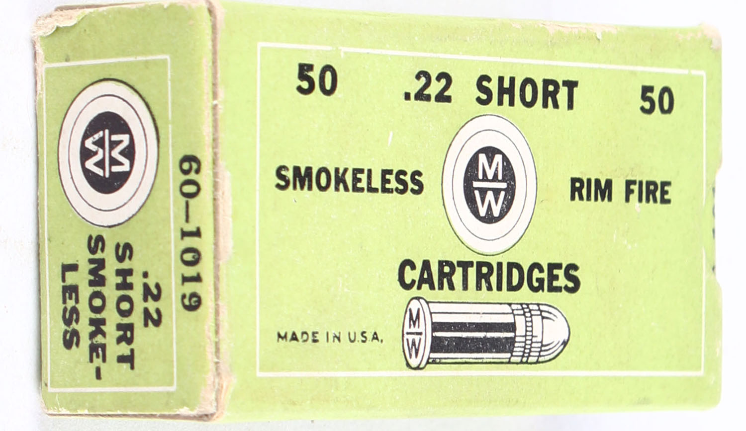 Wards, Smokeless Cartridges, .22 Short, RHWeb: MW-1 S-3b, Full, 1pc. Green black & white box, box is solid with excellent color, very minor corner wear, edges are mostly crisp, end flaps are solid, ammo is very good to excellent. Grade: Excellent + - Value: 300 to 450