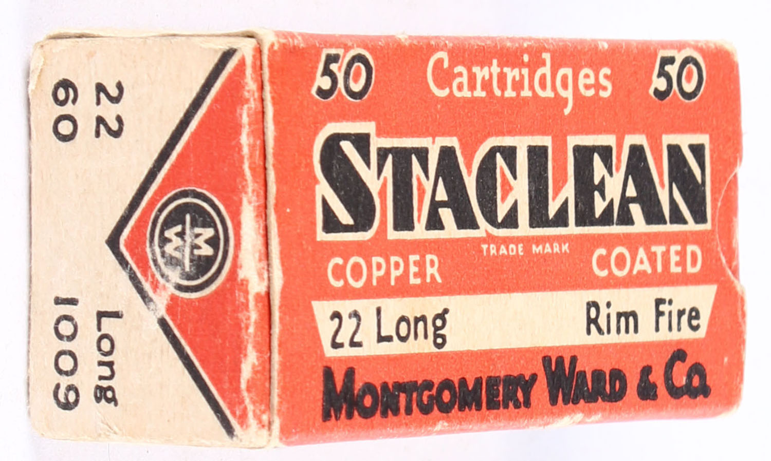 Wards, Staclean, .22 Long Copper Coated, RHWeb: MW-2 L-1, Partial 49rds. 1pc. Red buff & black box, box is solid with excellent color, very minor color fading, minor edge & corner wear, end flaps are solid, ammo is very good to excellent. Grade: Very Good ++ - Value: 80 to 120