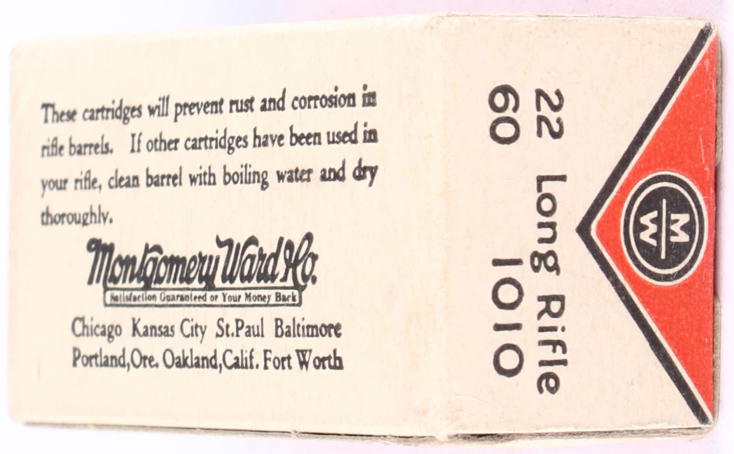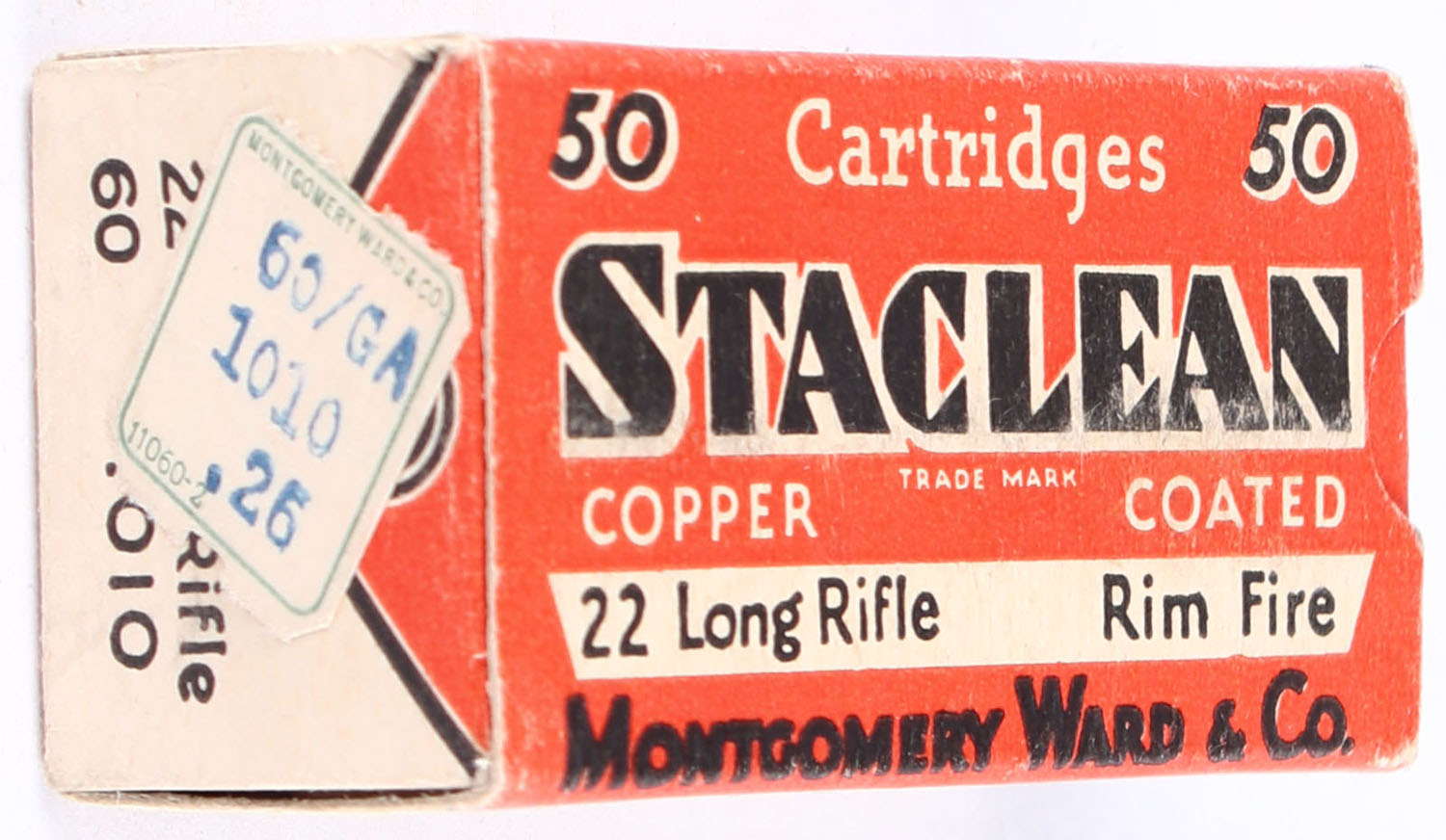 Wards, Staclean, .22 Long Rifle, Copper Coated, RHWeb: MW-3A LR-1, Full, 1pc. Red buff & black box, box is solid with excellent color, very minor corner wear, edges are crisp, end flaps are solid, ammo is excellent to minty. Grade: Excellent + - Value: 100 to 150