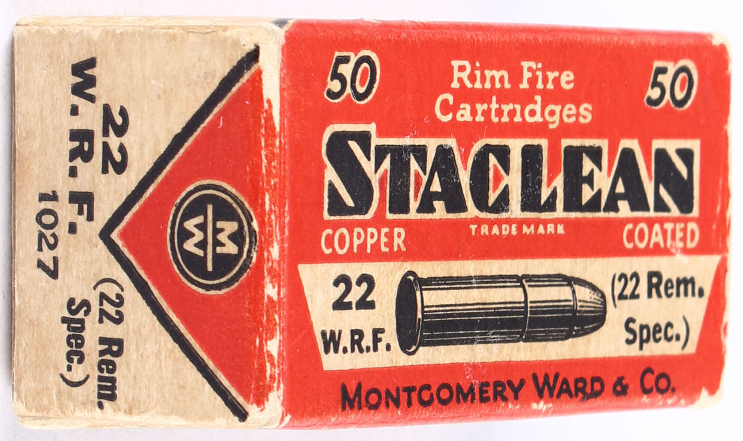 Wards, Staclean, .22 W.R.F., Copper Coated, RHWeb: MW-3A WRF-1, Partial 7rds. 1pc. Red buff & black box, box is solid with very good to excellent color, minor age soiling, some corner wear, very minor edge wear, end flaps are solid, ammo is excellent. Grade: Very Good + - Value: 20 to 30