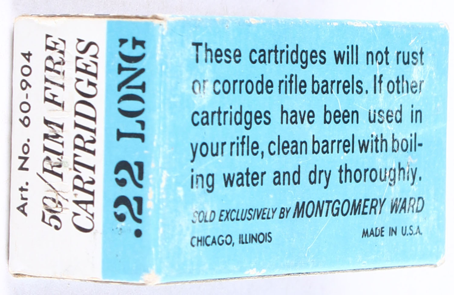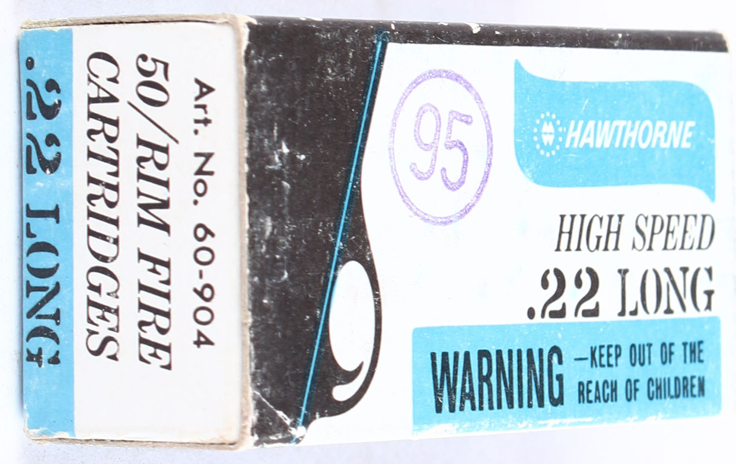 Wards, Hawthorne High Speed, .22 Long, RHWeb: MW-7 L-1a, Full, 1pc. White black & blue box, box is solid with excellent color, minor shelf wear, very minor corner wear, edges are crisp, end flaps are solid, ammo is minty. Grade: Excellent - Value: 10 to 15