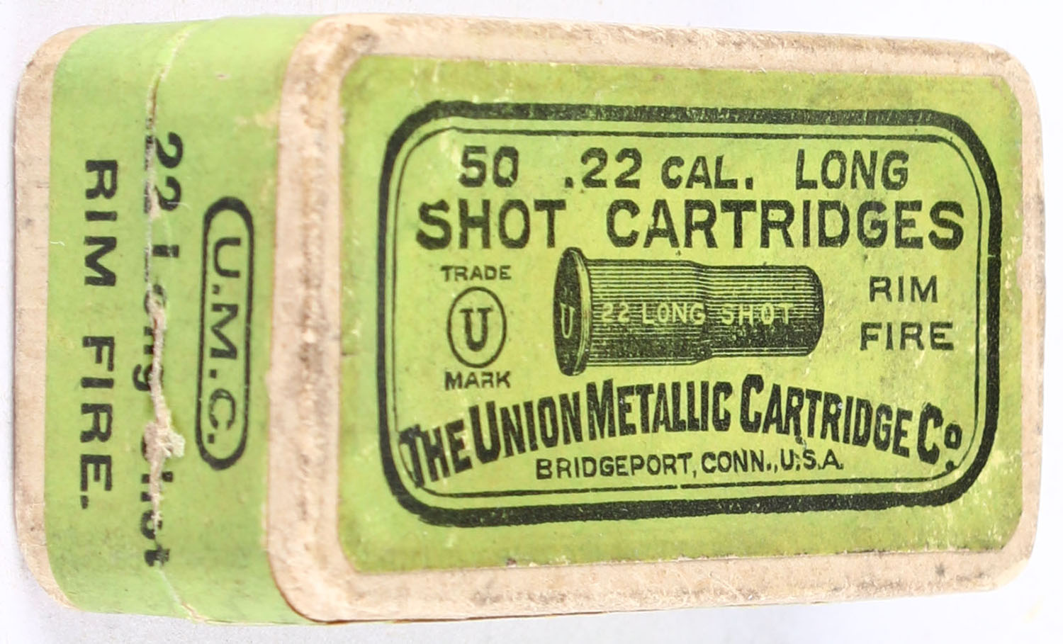 UMC, Shot Cartridges, .22 Long Shot, RHWeb: UMC-8 L-7, Full, 1pc. Buff box with green top & side sealing labels, box is solid with excellent color, very minor edge & corner wear, labels are intact, ammo is excellent. Grade: Excellent + - Value: 100 to 150