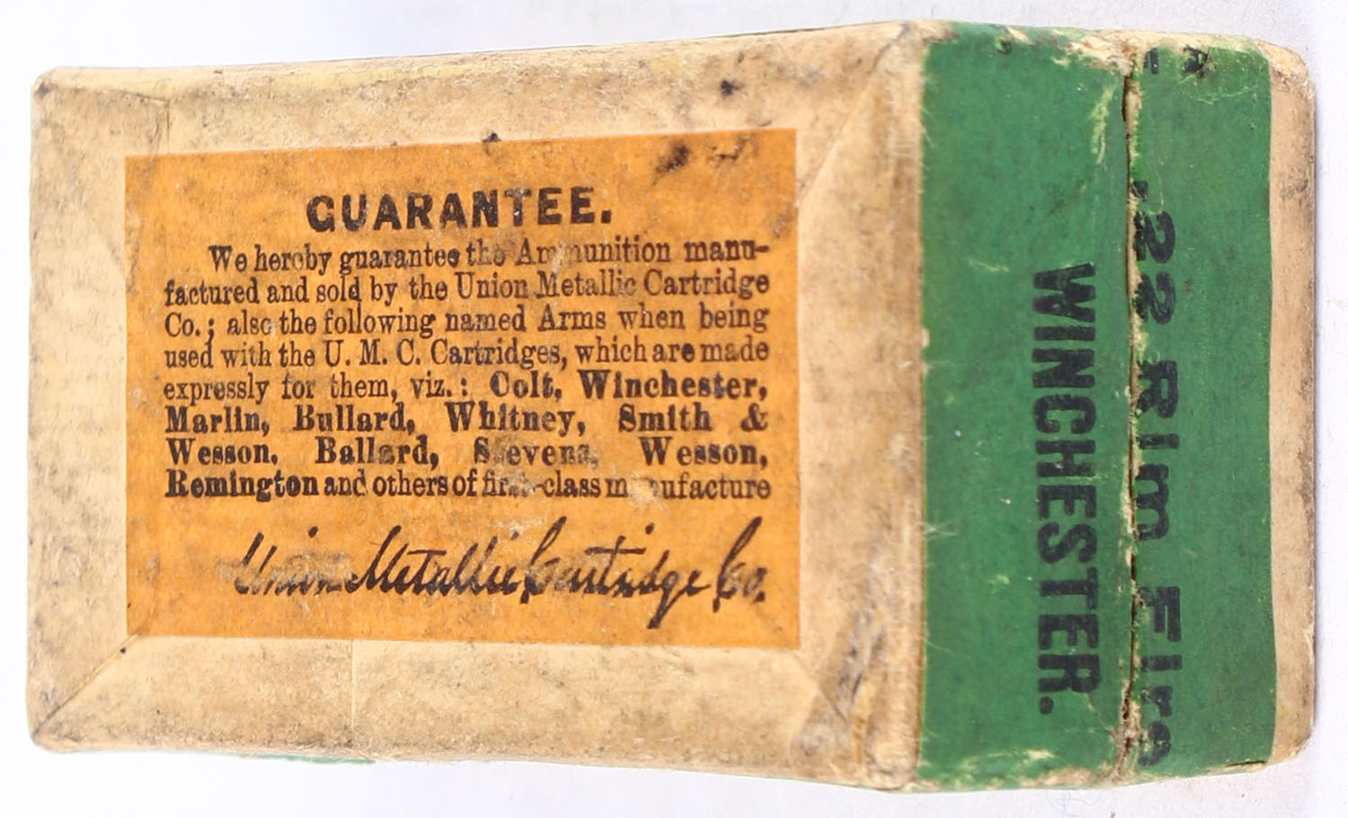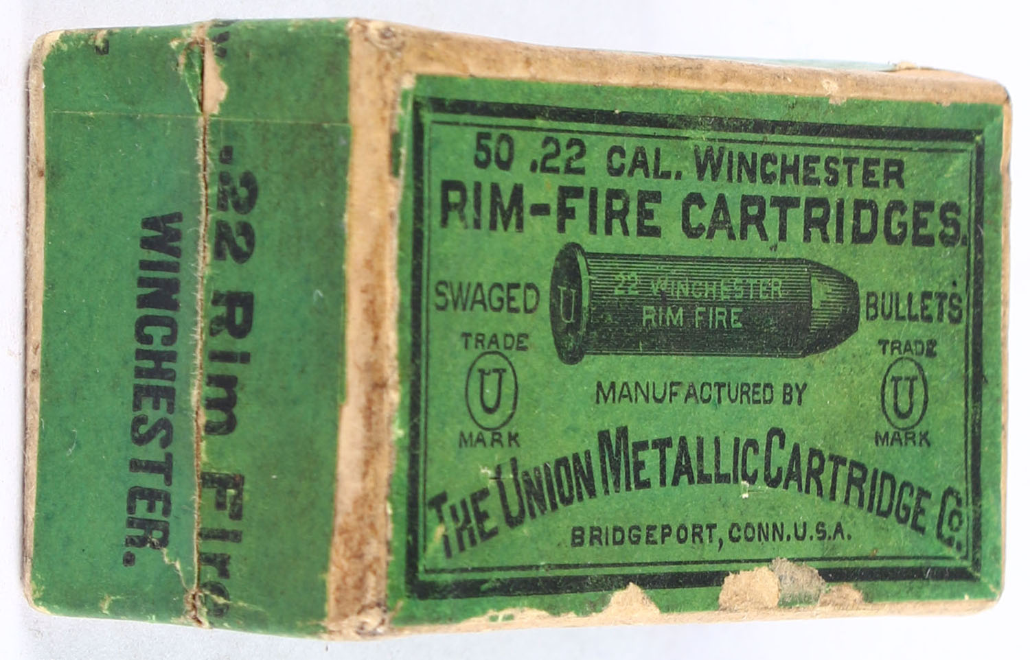 UMC, Rim-Fire Cartridges, .22 Winchester Rim Fire, Swaged Bullets, RHWeb: UMC-8.5 WRF-1, Full, 1pc. Buff box with green top & side sealing labels, box is solid with excellent color, very minor label chipping on top, minor corner wear, very minor edge wear, labels are intact, ammo is excellent. Grade: Excellent - Value: 40 to 60