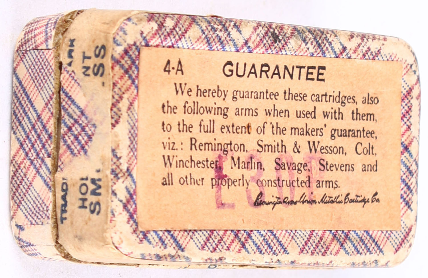 REM-UMC, R.F. Smokeless Cartridges, .22 Short Hollow Point, RHWeb: REM-1 S-6, Empty, 2pc. Purple fabric box, box is solid with excellent color, very minor age soiling & corner wear, edges are mostly crisp, side sealing label is 70% intact. Grade: Very Good ++ - Value: 16 to 24