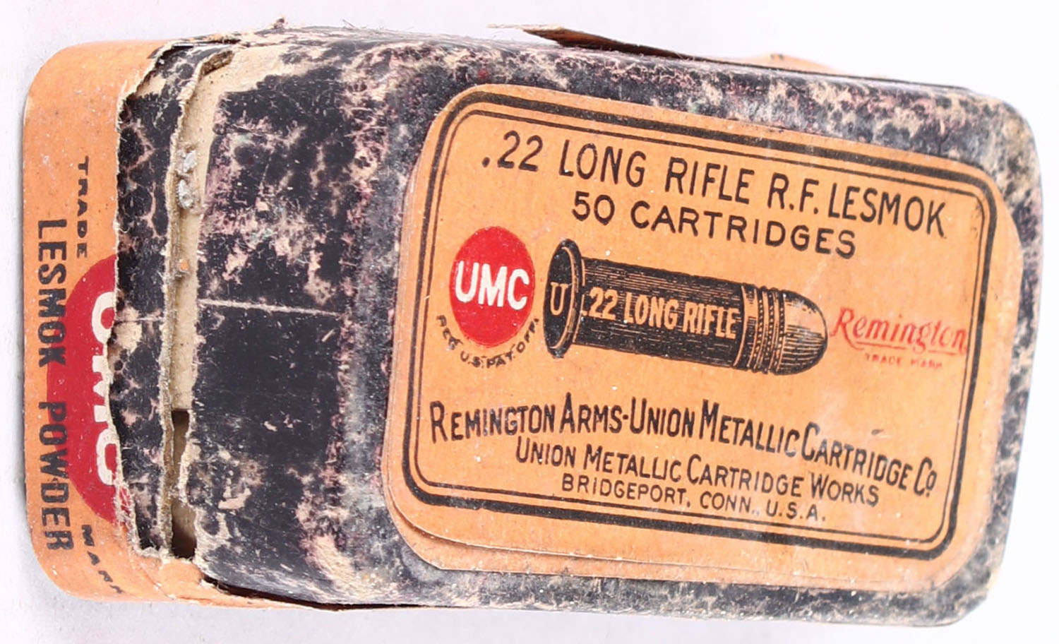 REM-UMC, R.F. Lesmok Cartridges, .22 Long Rifle, RHWeb: REM-1 LR-2A, Partial 44rds. 2pc. Black mottled box with orange top & side sealing labels, box is solid with excellent color, some edge & corner wear, side sealing label is 65% intact and has started to peel, ammo is good. Grade: Good ++ - Value: 10 to 15