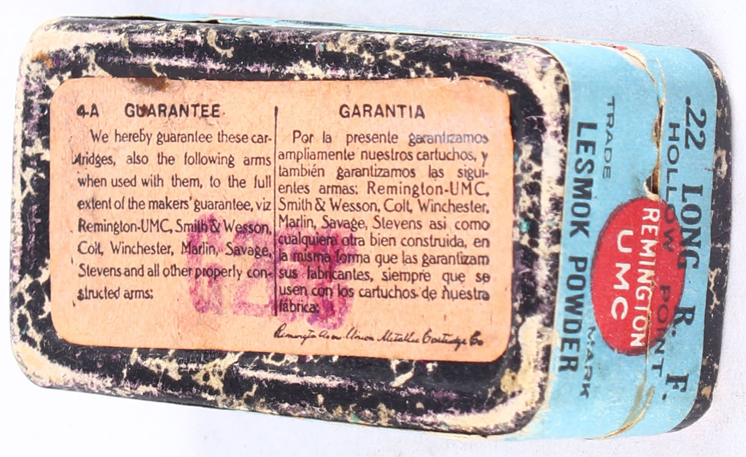 REM-UMC, R.F. Lesmok Cartridges, .22 Long Hollow Point, 29 Grs. Bullet, Full, 2pc. Black mottled box, box is solid with blue top & side sealing labels, box is solid with excellent color, minor shelf & corner wear, very minor edge wear, labels are intact, ammo is good to very good. Grade: Excellent - Value: 80 to 120