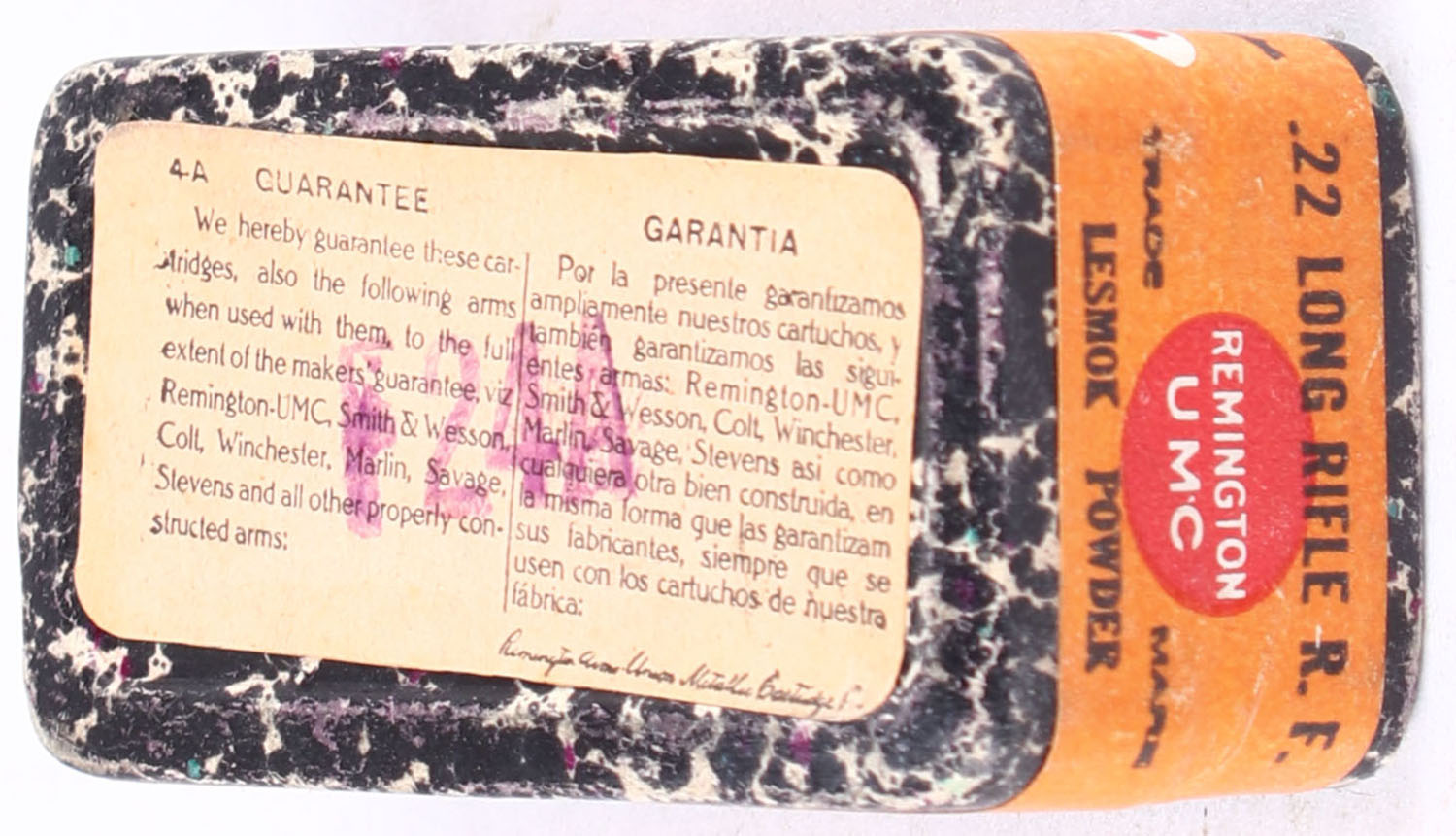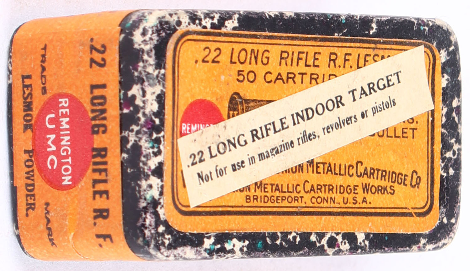 REM-UMC, Indoor Target, .22 Long Rifle, Lesmok Powder, RHWeb: REM-50B LR-1A, FULL & SEALED, 2pc. Black mottled box with orange top & side sealing labels, white ''Indoor Target'' over-label, box is solid with excellent color, very minor corner wear, edges are mostly crisp, labels are intact. Grade: Excellent ++ - Value: 300 to 450