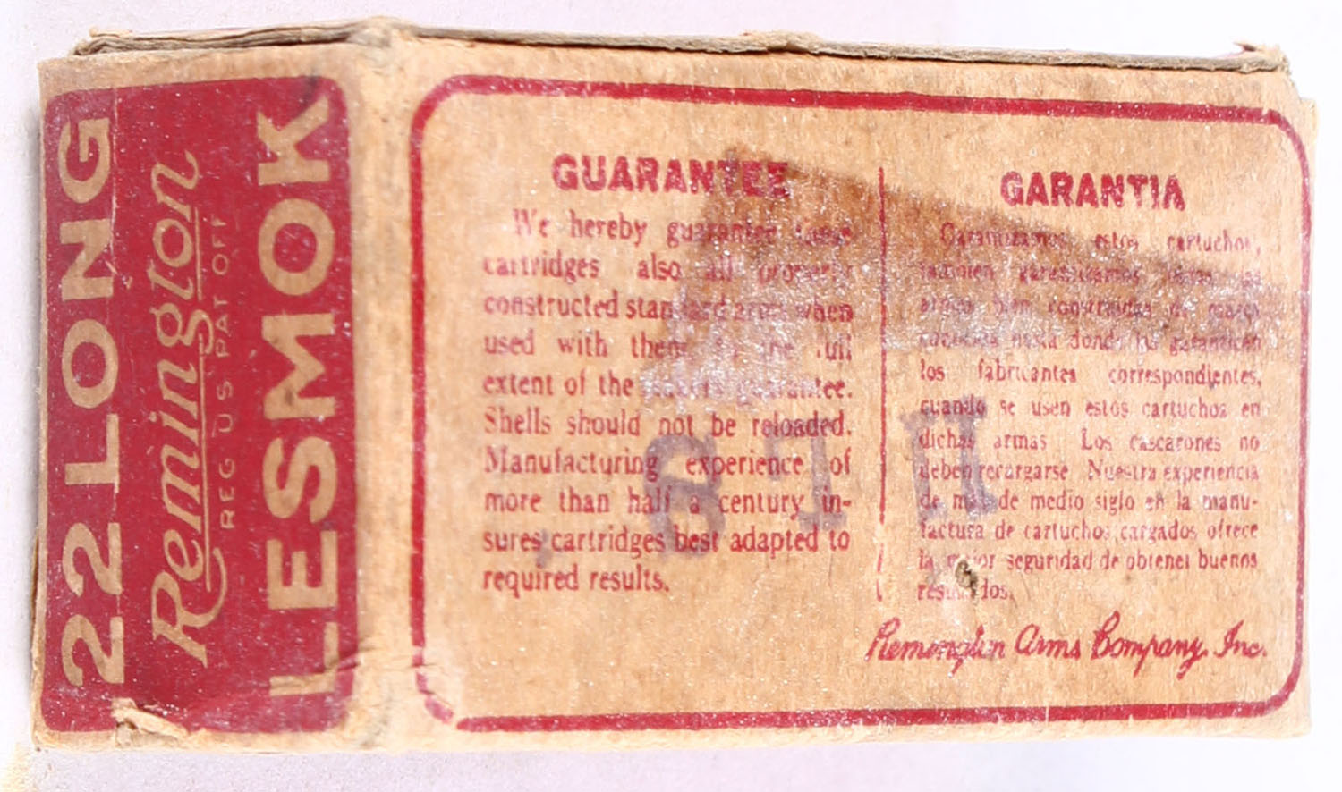 REM-UMC, R.F. Lesmok Cartridges, .22 Long, RHWeb: REM-6 L-2A, Partial 44rds., 1pc. Red & buff box, box is solid with very good color, some age soiling & shelf wear, minor edge & corner wear, end flaps are solid, ammo is fair to good. Grade: Very Good - Value: 24 to 36