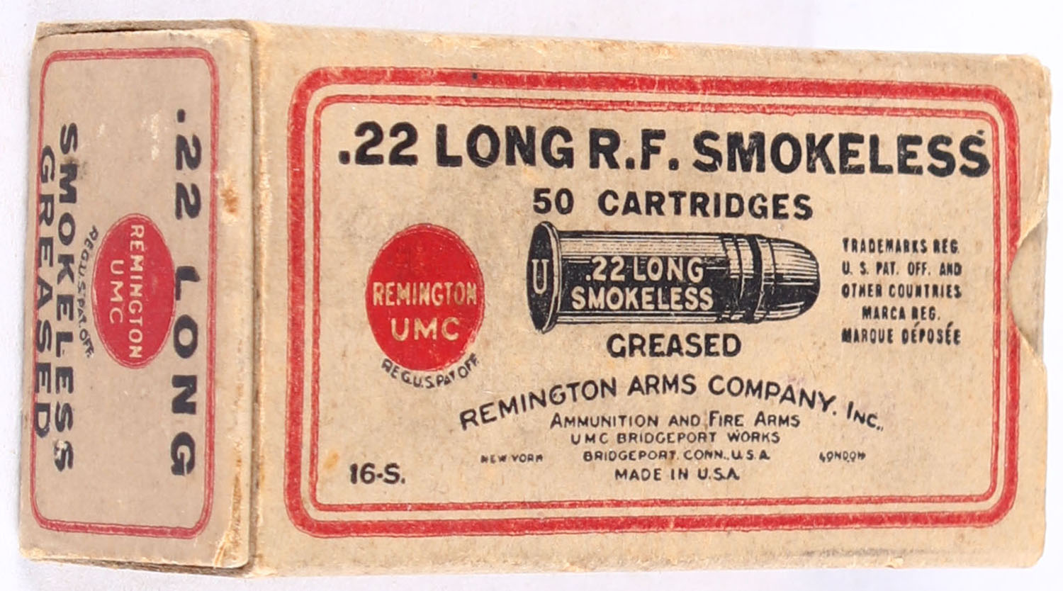 REM-UMC, R.F. Smokeless Cartridges, .22 Long, Greased, RHWeb: REM-6 L-6, Full, 1pc. Buff black & red box, box is solid with excellent color, very minor edge & corner wear, end flaps are solid, ammo is excellent. Grade: Excellent + - Value: 100 to 150