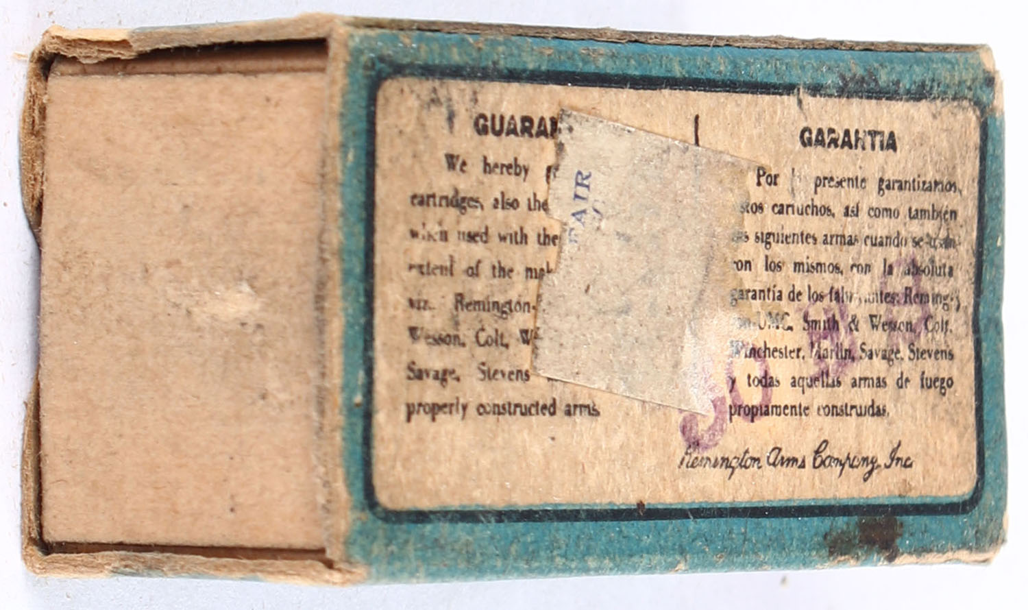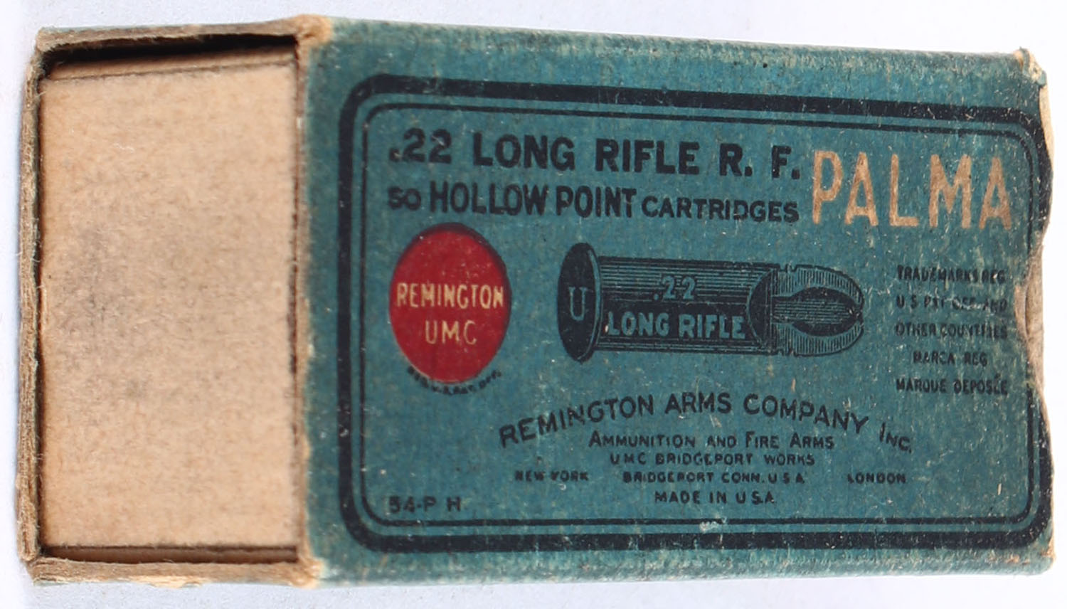 REM-UMC, Palma, .22 Long Rifle Hollow Point, Lesmok, RHWeb: REM-52 LR-2, Partial 44rds. 1pc. Blue & black box, box is missing both end flaps, very good color, some age soiling & corner wear, very minor edge wear, ammo is correct, but hollow points appear to have been modified. Grade: Good - Value: 30 to 45