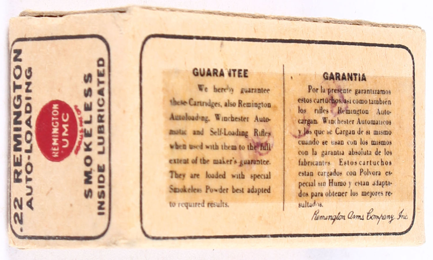 REM-UMC, Rim Fire Cartridges, .22 Remington Autoloading, Smokeless, Inside Lubricated, RHWeb: REM-6 RA-1A, Full, 1pc. Buff & black box, box is solid with excellent color, very minor edge & corner wear, end flaps are solid, ammo is very good to excellent. Grade: Excellent + - Value: 100 to 150