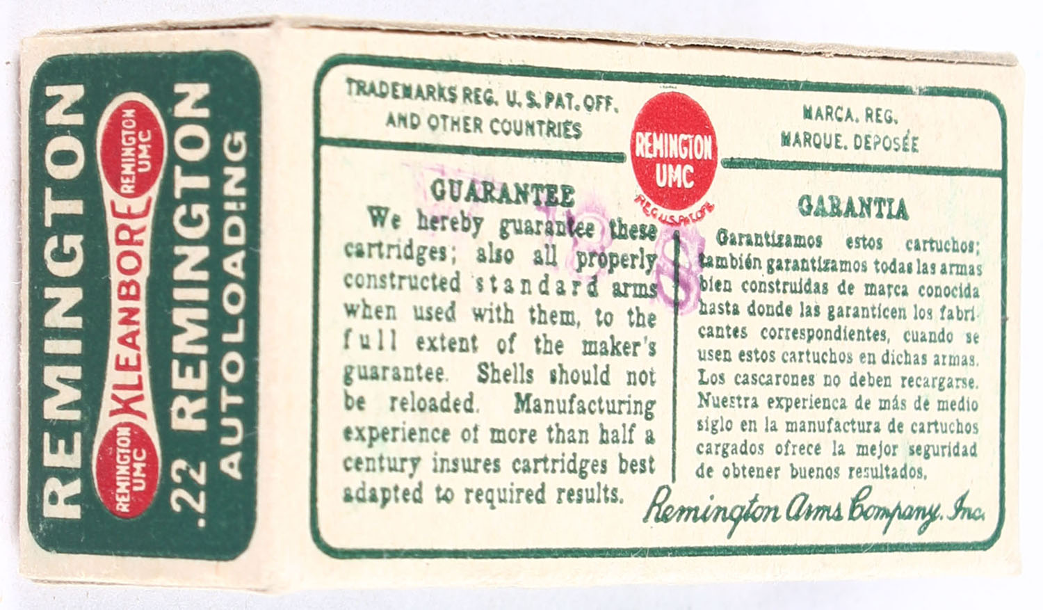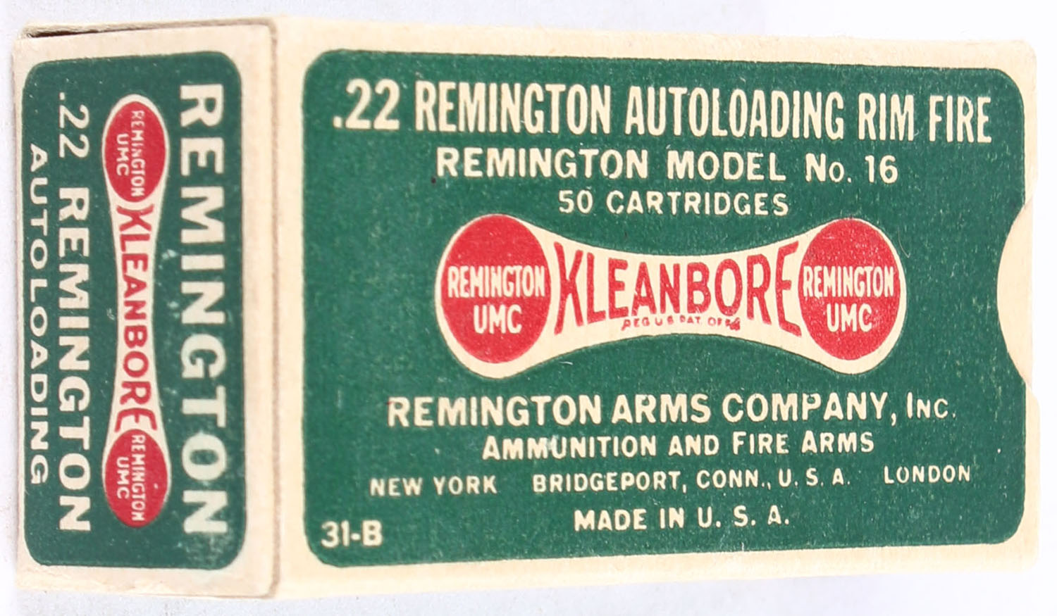 Remington, Kleanbore, .22 Remington Autoloading, RHWeb: REM-7.1A RA-1, Full, 1pc. Green buff & red dog bone box, box is solid with excellent color, very minor edge & corner wear, end flaps are solid, ammo is excellent. Grade: Excellent ++ - Value: 80 to 120