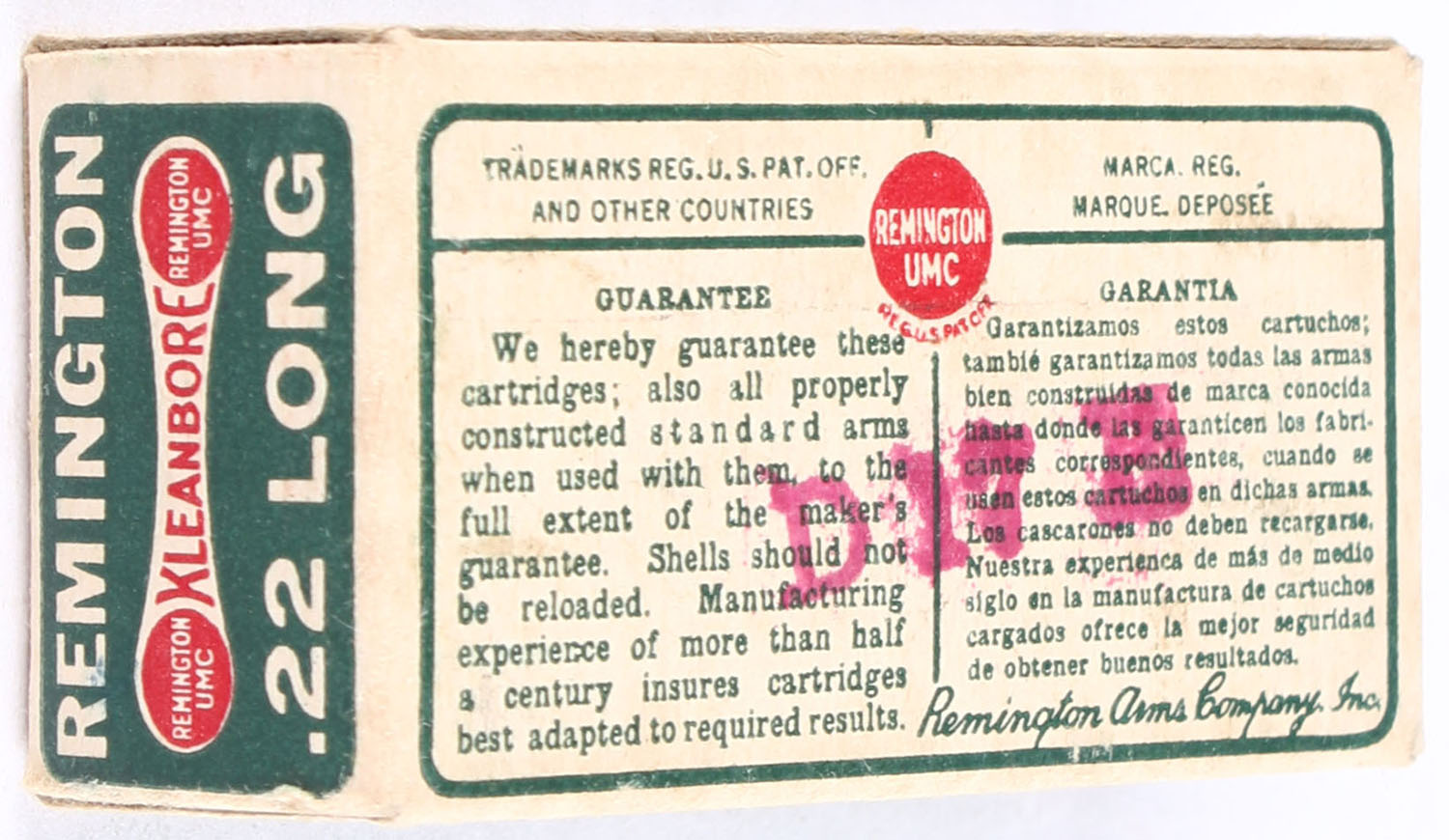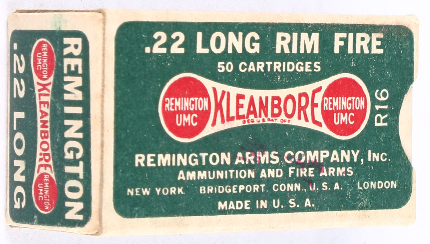 Remington, Kleanbore, .22 Long, RHWeb: REM-7.1B L-1d, Full, 1pc. Green buff & red dog bone box, box is solid with excellent color, very minor shelf & corner wear, edges are crisp, end flaps are solid, ammo is excellent. Grade: Excellent + - Value: 30 to 45