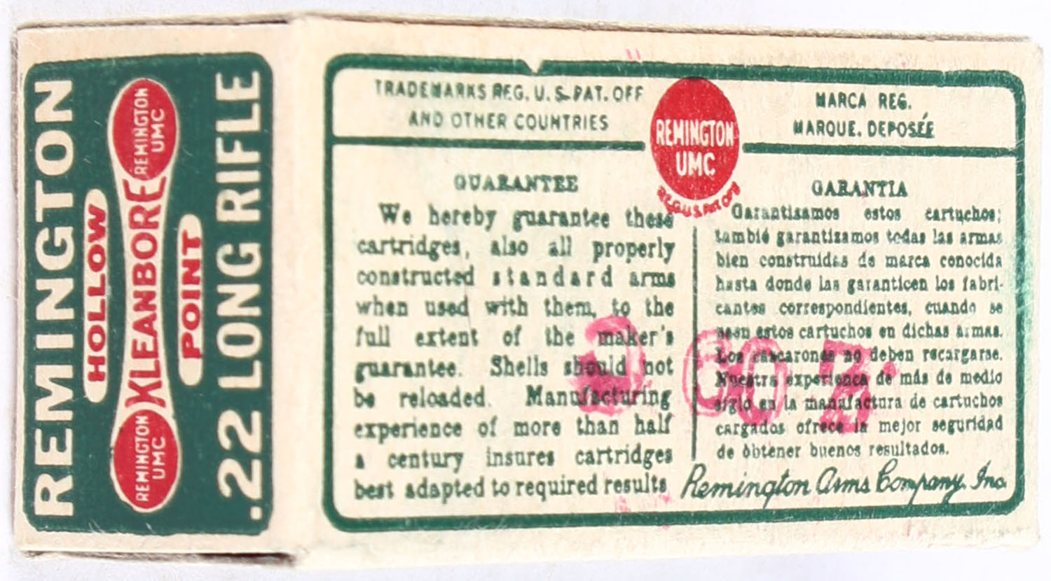 Remington, Kleanbore, .22 Long Rifle Hollow Point, RHWeb: REM-7.1B LR-2, Full, 1pc. Green buff & red dog bone box, box is solid with excellent color, very minor shelf & corner wear, edges are crisp, end flaps are solid, ammo is excellent. Grade: Excellent ++ - Value: 20 to 30