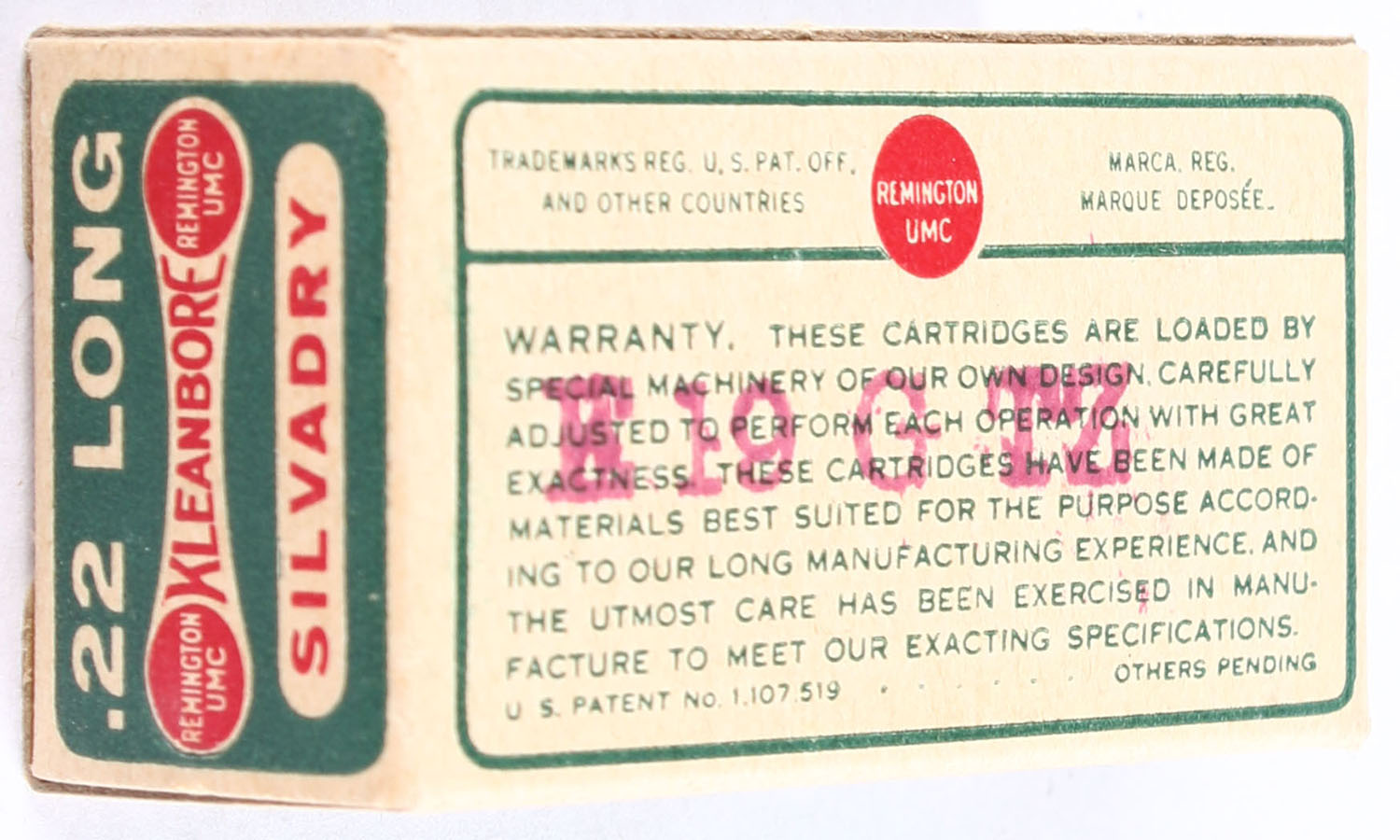 Remington, Kleanbore Silvadry, .22 Long, RHWeb: REM-7.3 L-1b, Full, 1pc. Green buff & red dog bone box, box is solid with excellent color, very minor shelf wear, corners are mostly sharp, edges are crisp, end flaps are solid, ammo is excellent. Grade: Excellent + - Value: 120 to 180