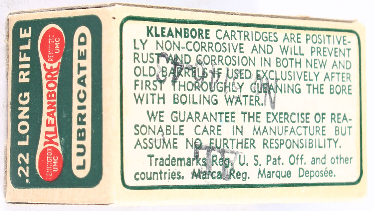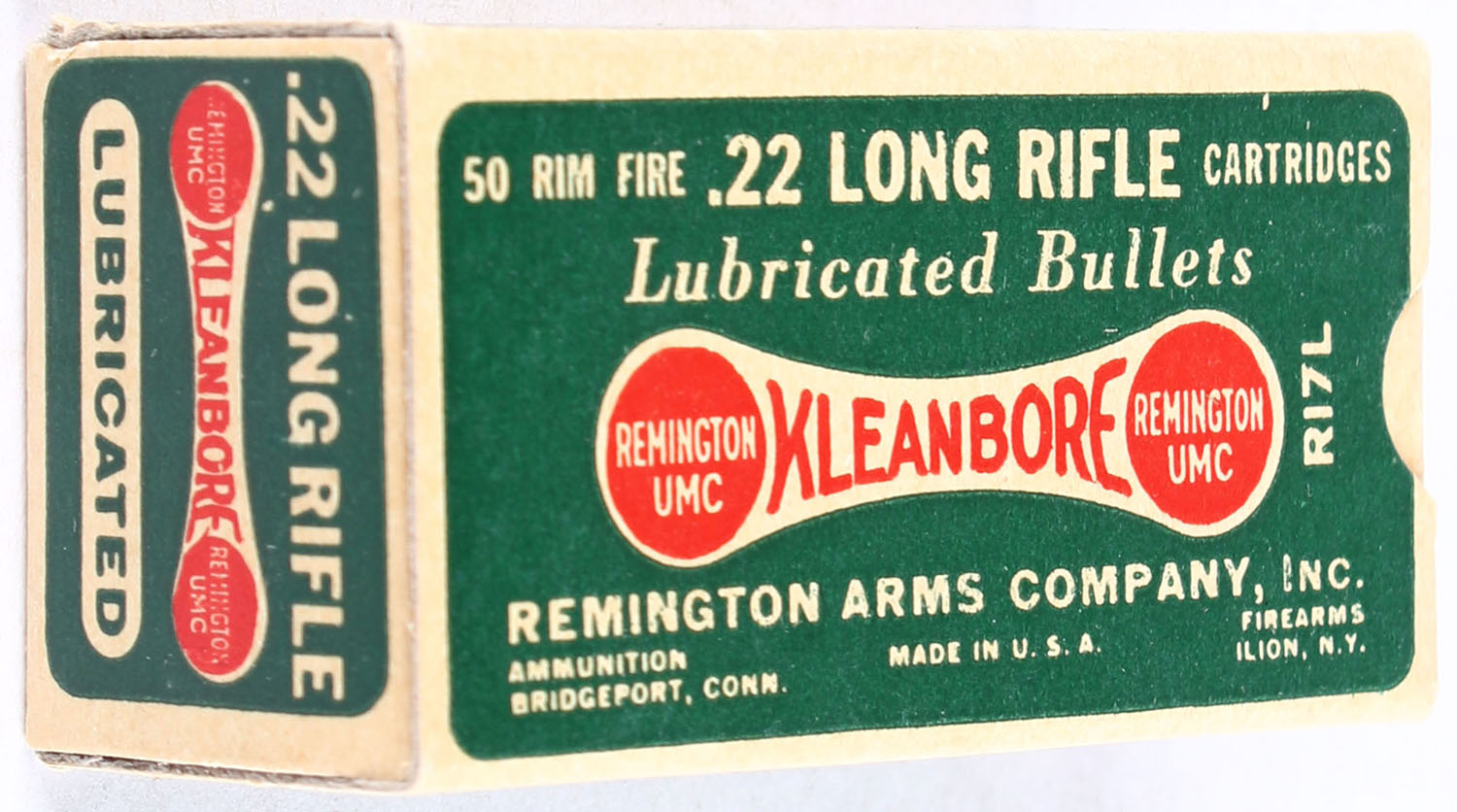 Remington, Kleanbore Lubricated, .22 Long Rifle, RHWeb: REM-7.2 LR-1j, Full, 1pc. Green buff & red dog bone box, box is MINT with minty color, corners are mostly sharp, edges are crisp, end flaps are solid, ammo is excellent. Grade: MINT - Value: 10 to 15
