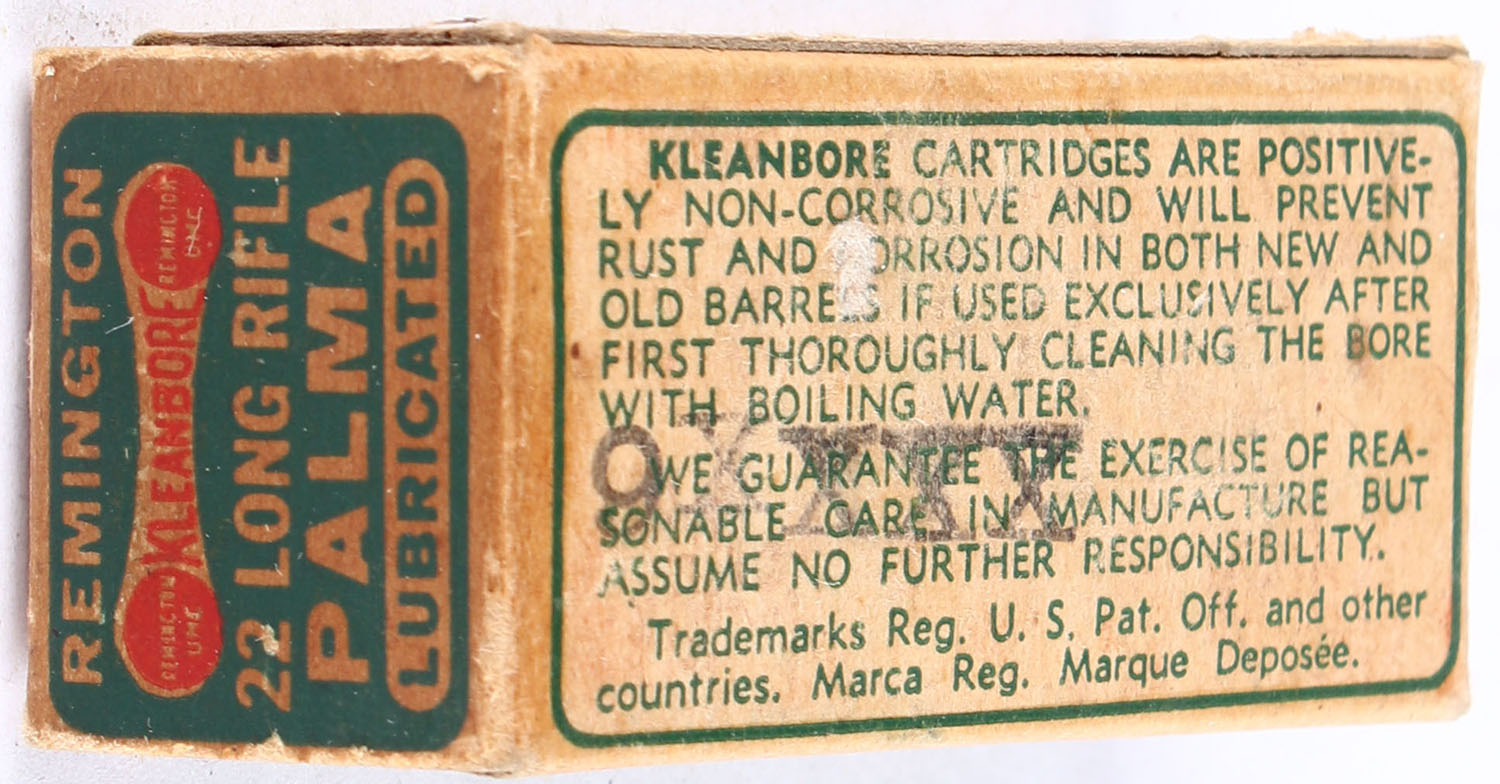 Remington, Palma Kleanbore, .22 Long Rifle, Lubricated, RHWeb: REM-52 LR-13, Full, 1pc. Green buff & red dog bone box, box is solid with very good color, minor age soiling, very minor corner wear, edges are mostly crisp, end flaps are solid, ammo is excellent. Grade: Excellent - Value: 16 to 24