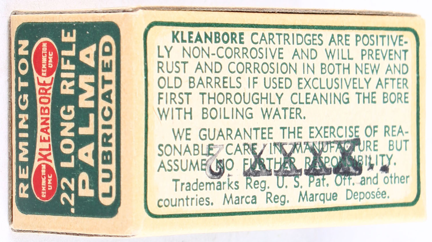 Remington, Palma Kleanbore, .22 Long Rife, Lubricated, RHWeb: REM-52 LR-88a, Full, 1pc. Green buff & red dog bone box, box is near mint with excellent to minty color, only very minor age soiling, corners are mostly sharp, edges are crisp, end flaps are solid, ammo is excellent. Grade: Excellent ++ - Value: 30 to 45
