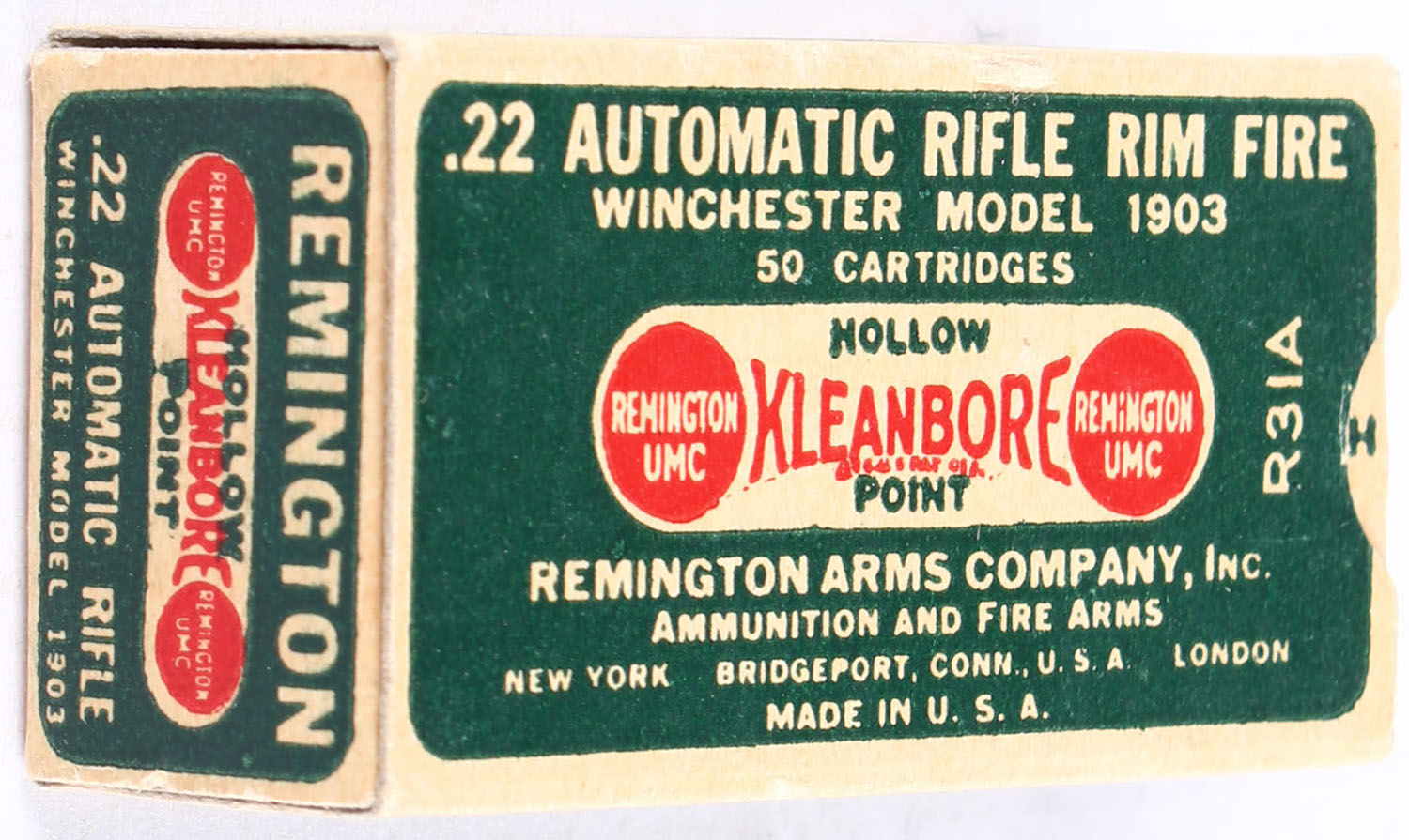 Remington, Kleanbore, .22 Winchester Automatic Hollow Point, RHWeb: REM-7.1B WA-2d, Full, 1pc. Green buff & white dog bone box, box is solid with excellent color, very minor age soiling, corners are sharp, edges are crisp, end flaps are solid, ammo is excellent. Grade: Excellent ++ - Value: 200 to 300