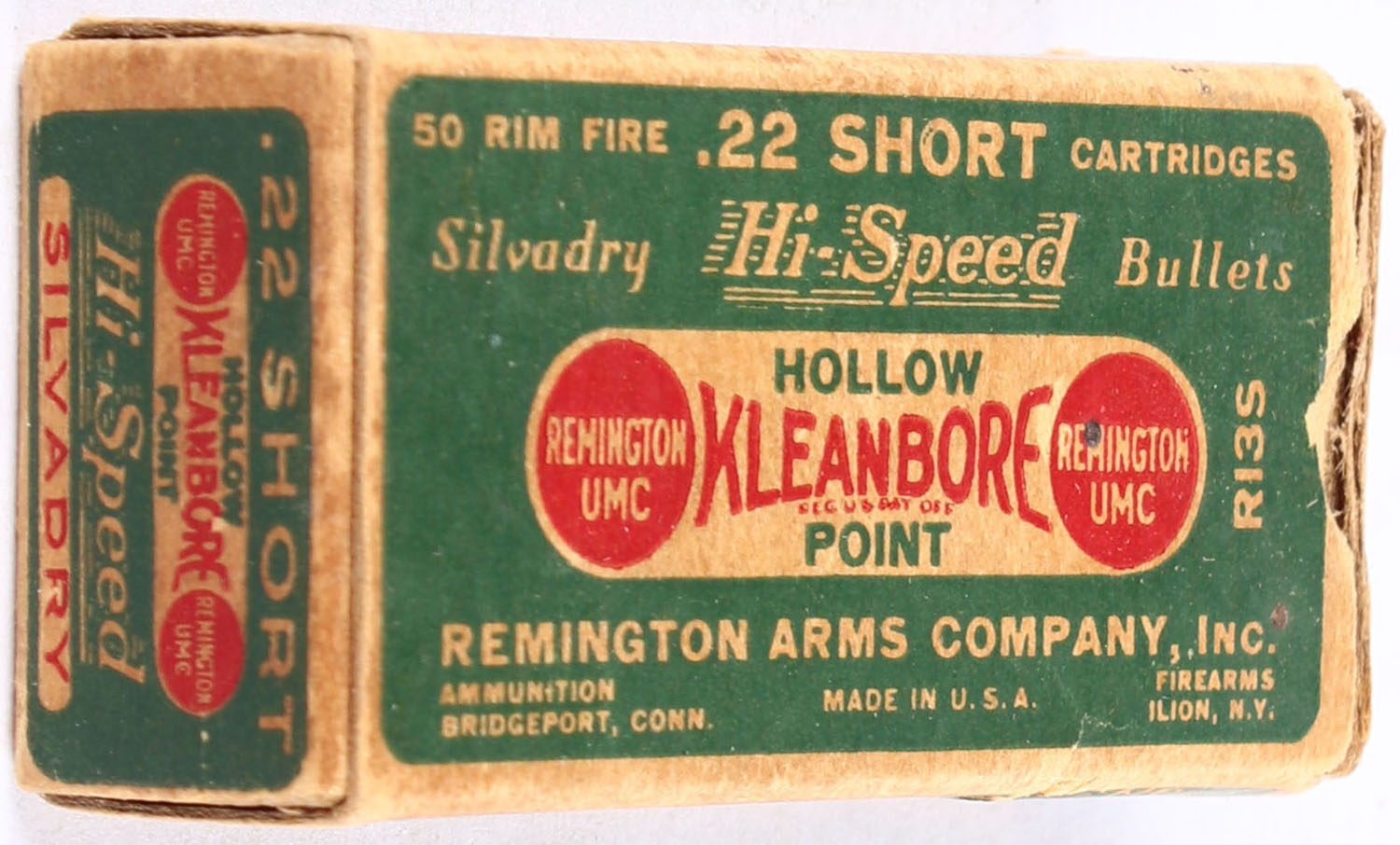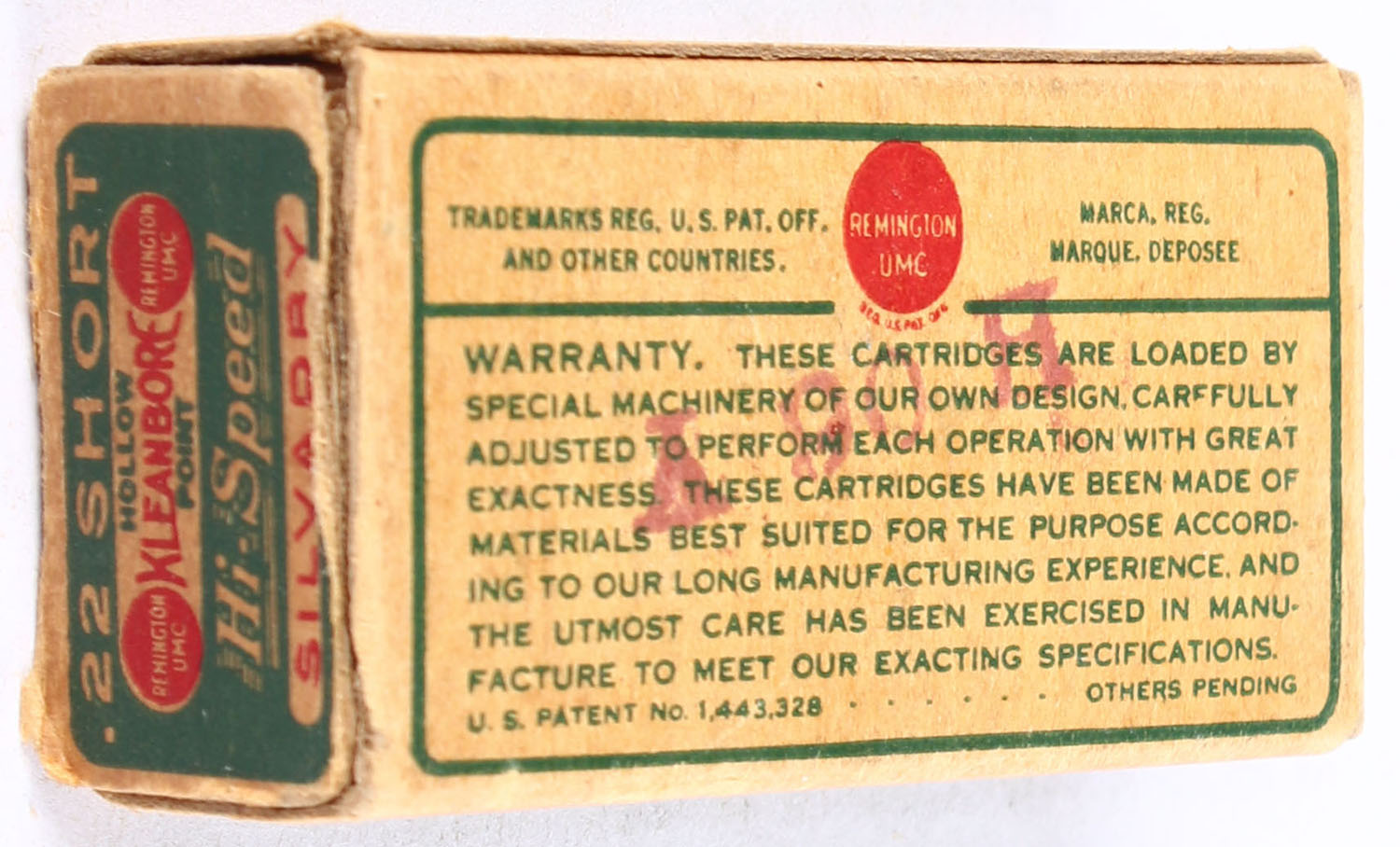 Remington, Silvadry Hi-Speed Kleanbore, .22 Short Hollow Point, RHWeb: REM-7.5 S-3, Partial 46rds, 1pc. Green buff & red box, right end flap is torn and taped at the insert tab, very good color, some age soiling & corner wear, minor edge wear, left end flap is solid, ammo is excellent. Grade: Good ++ - Value: 12 to 18
