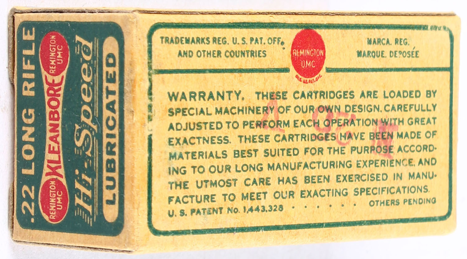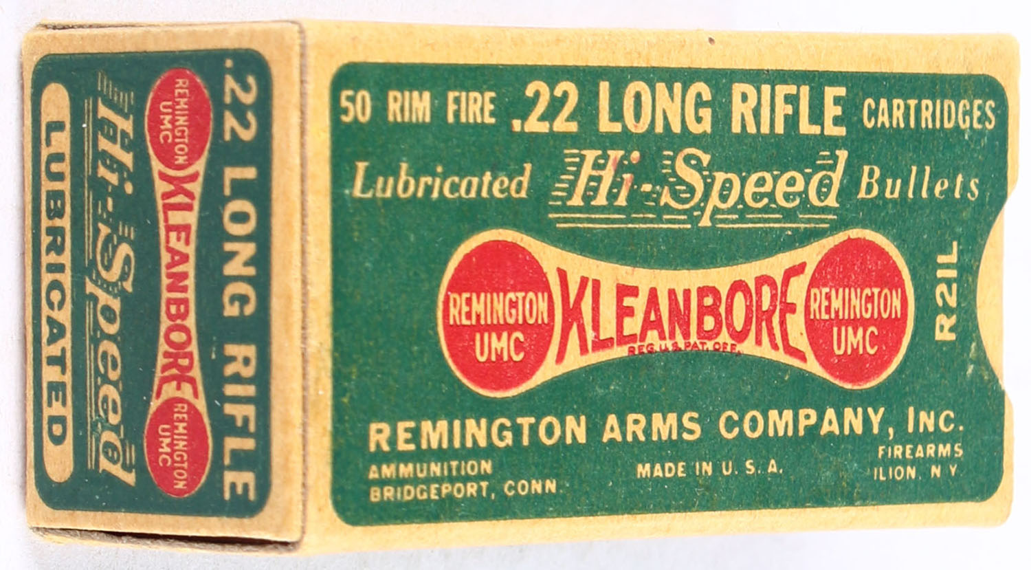 Remington, Hi-Speed Kleanbore, .22 Long Rifle, RHWeb: REM-7.4 LR-1i, Partial 46rds., 1pc. Green buff & red dog bone box, box is solid with excellent color, very minor corner wear, edges are crisp, end flaps are solid, ammo is excellent. Grade: Excellent + - Value: 12 to 18
