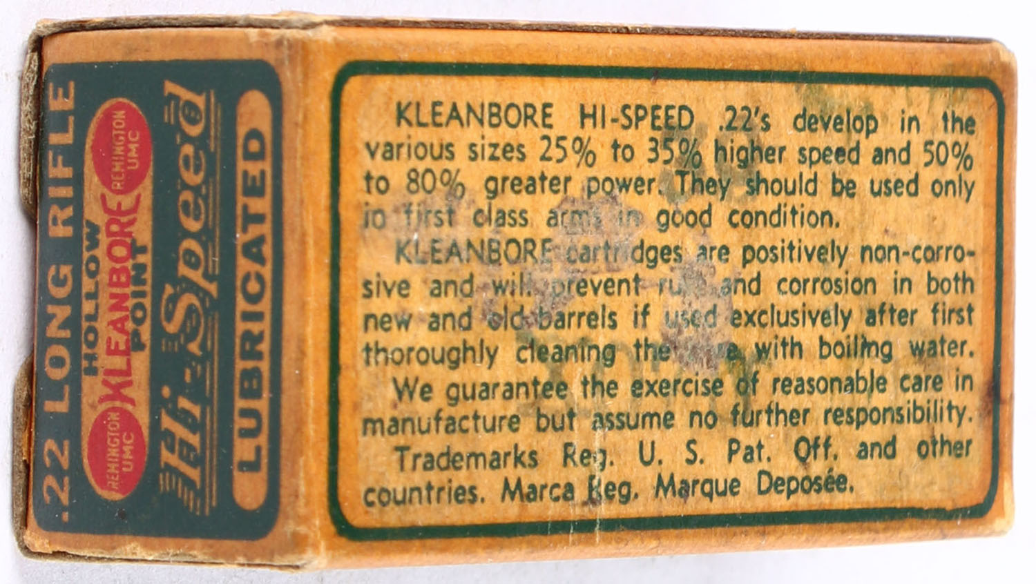 Remington, Hi-Speed Kleanbore, .22 Long Rifle Hollow Point, RHWeb: REM-7.4 LR-3d (only with back IV), 1pc. Green buff & red dog bone box, box is solid with good to very good color, age soiling, minor corner wear, edges are mostly crisp, end flaps are solid, ammo is very good. Grade: Very Good + - Value: 10 to 15
