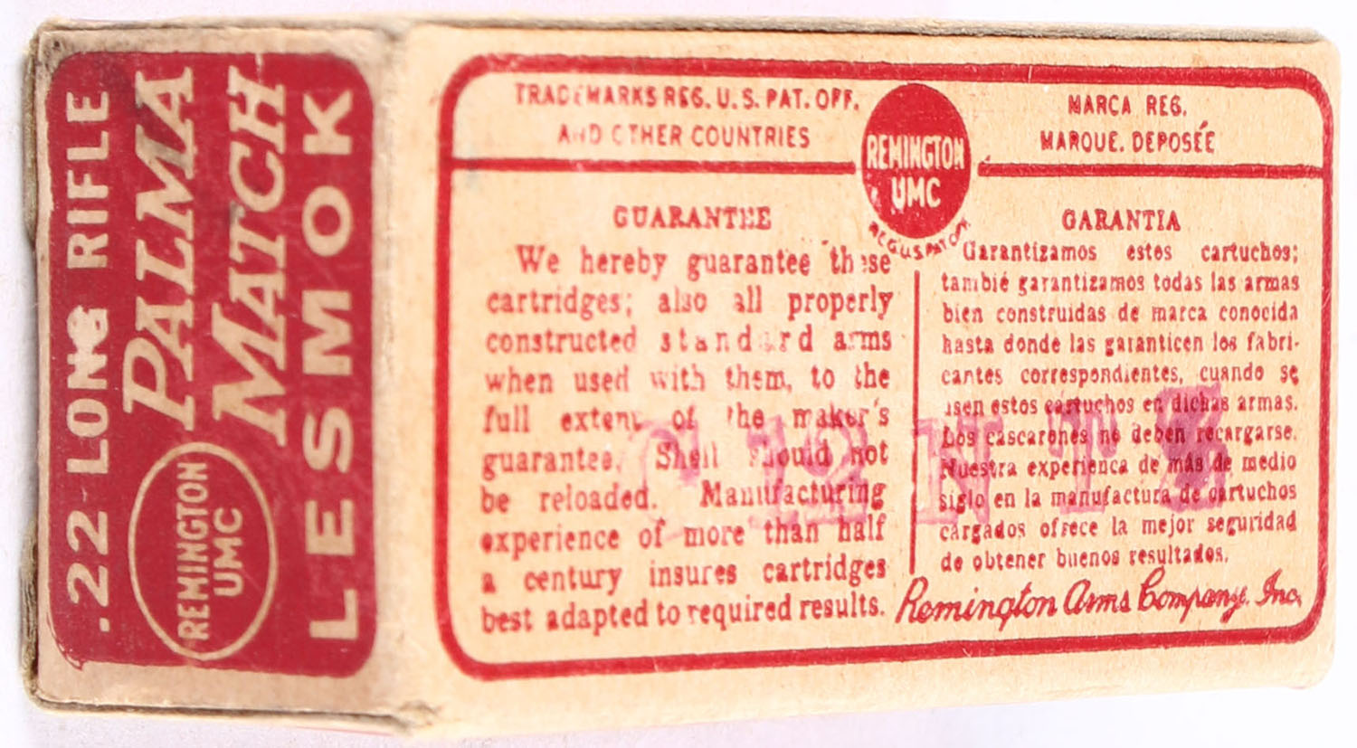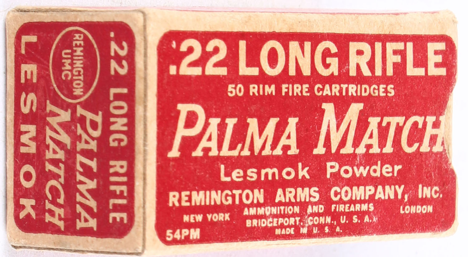 Remington, Palma Match, .22 Long Rifle, Lesmok Powder, RHWeb: REM-52 LR-4, Full, 1pc. Red & buff box, box is solid with excellent color, very minor age soiling & corner wear, edges are mostly crisp, end flaps are solid, ammo is very good. Grade: Excellent - Value: 50 to 75