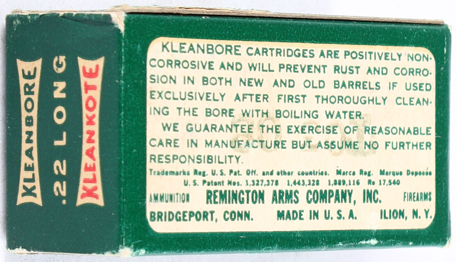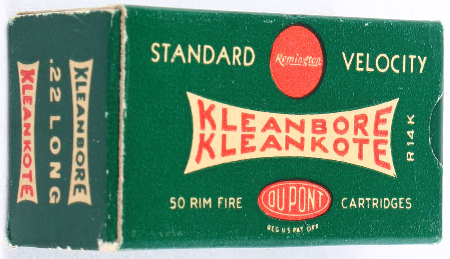 Remington, Kleanbore Kleankote, .22 Long, Standard Velocity, RHWeb: REM-9 L-3a, Full, 1pc. Green white & red box, box is solid with excellent color, very minor corner wear, edges are crisp, end flaps are solid, ammo is excellent. Grade: Excellent + - Value: 60 to 90
