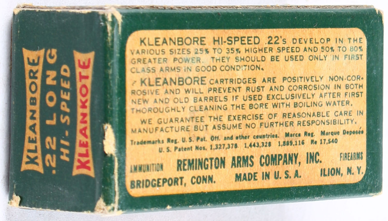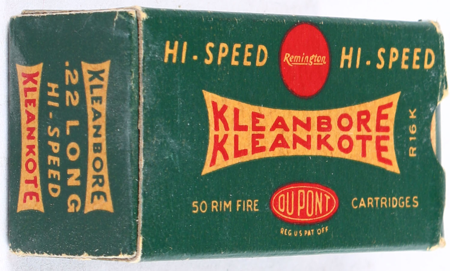 Remington, Kleanbore Kleankote, Hi-Speed, .22 Long, RHWeb: REM-9 L-1b, Full, 1pc. Green white & red box, box is solid with very good to excellent color, minor age soiling & corner wear, edges are crisp, end flaps are solid, ammo is very good. Grade: Very Good ++ - Value: 30 to 45