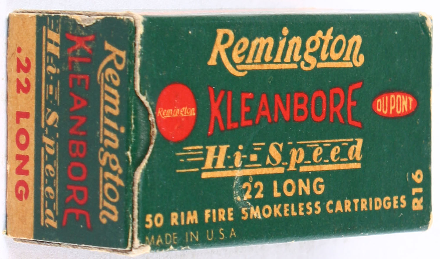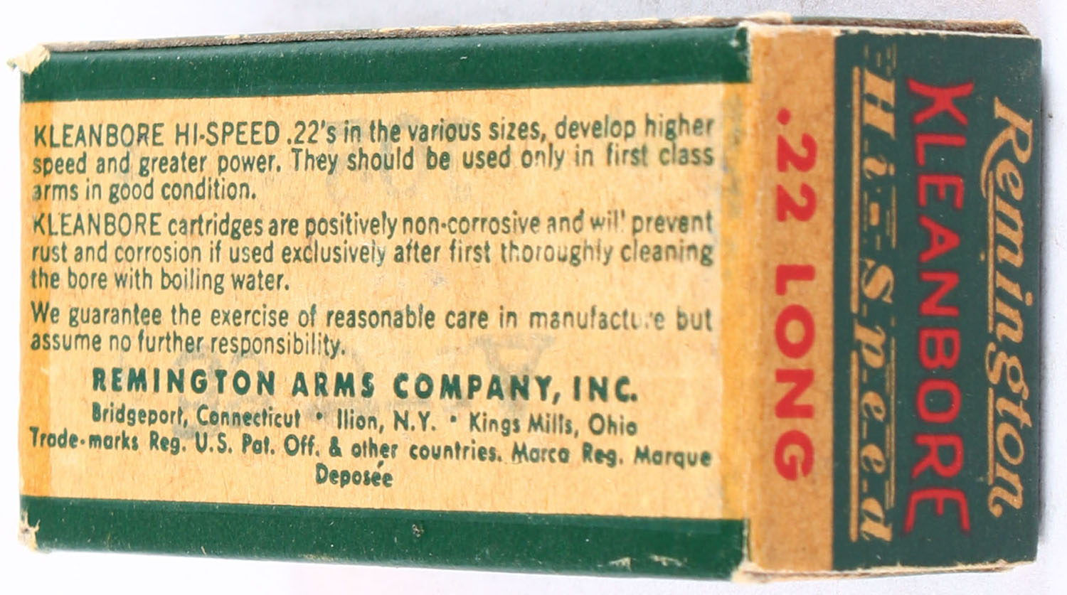 Remington, Kleanbore Hi-Speed, .22 Long, RHWeb: REM-10 L-1b, Full, 1pc. Green buff & red box, box is solid with excellent color, very minor edge & corner wear, end flaps are solid, ammo is excellent. Grade: Excellent - Value: 14 to 20