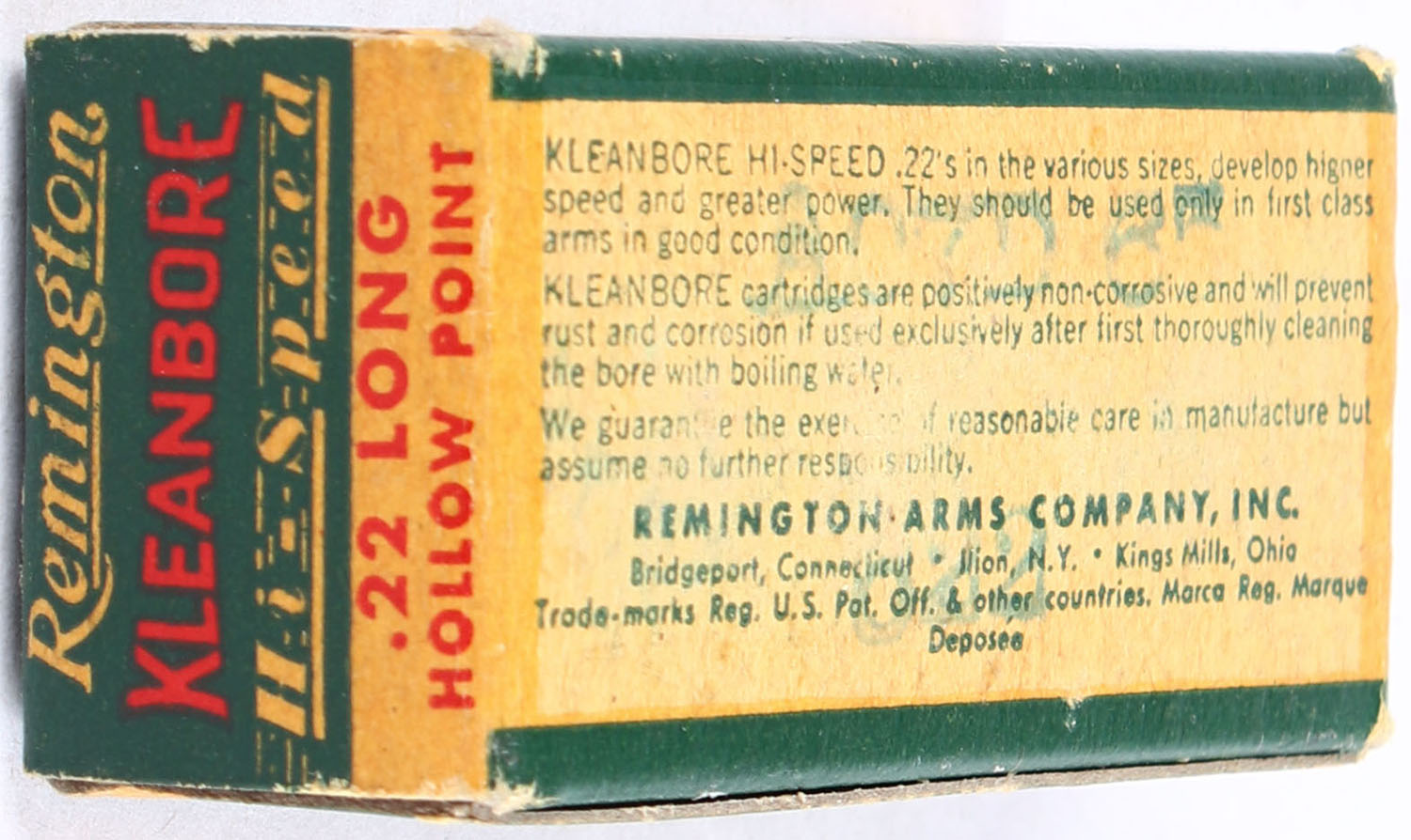 Remington, Kleanbore Hi-Speed, .22 Long Hollow Point, RHWeb: REM-10 L-2b, Partial 41rds., 1pc. Green buff & red box, box is solid with excellent color, some corner wear, very minor edge wear, end flaps are solid, ammo is excellent. Grade: Very Good ++ - Value: 8 to 12