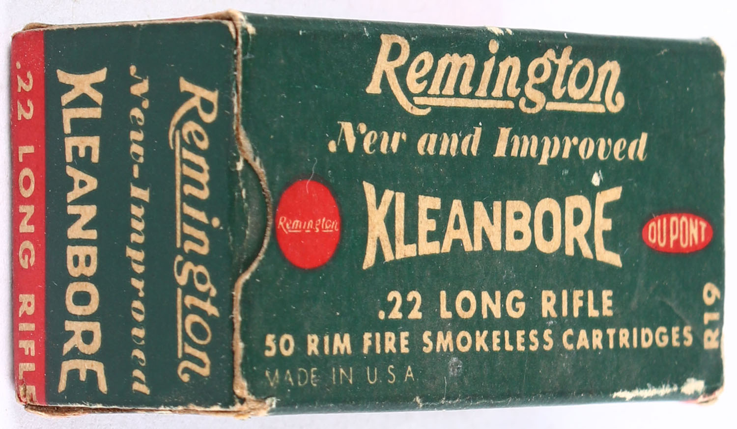 Remington, New and Improved Kleanbore, .22 Long Rifle, RHWeb: REM-11 LR-1, Full, 1pc. Green buff & red box, box is solid with excellent color, very minor age soiling, some corner wear, very minor edge wear, end flaps are solid, ammo is very good. Grade: Very Good ++ - Value: 6 to 10
