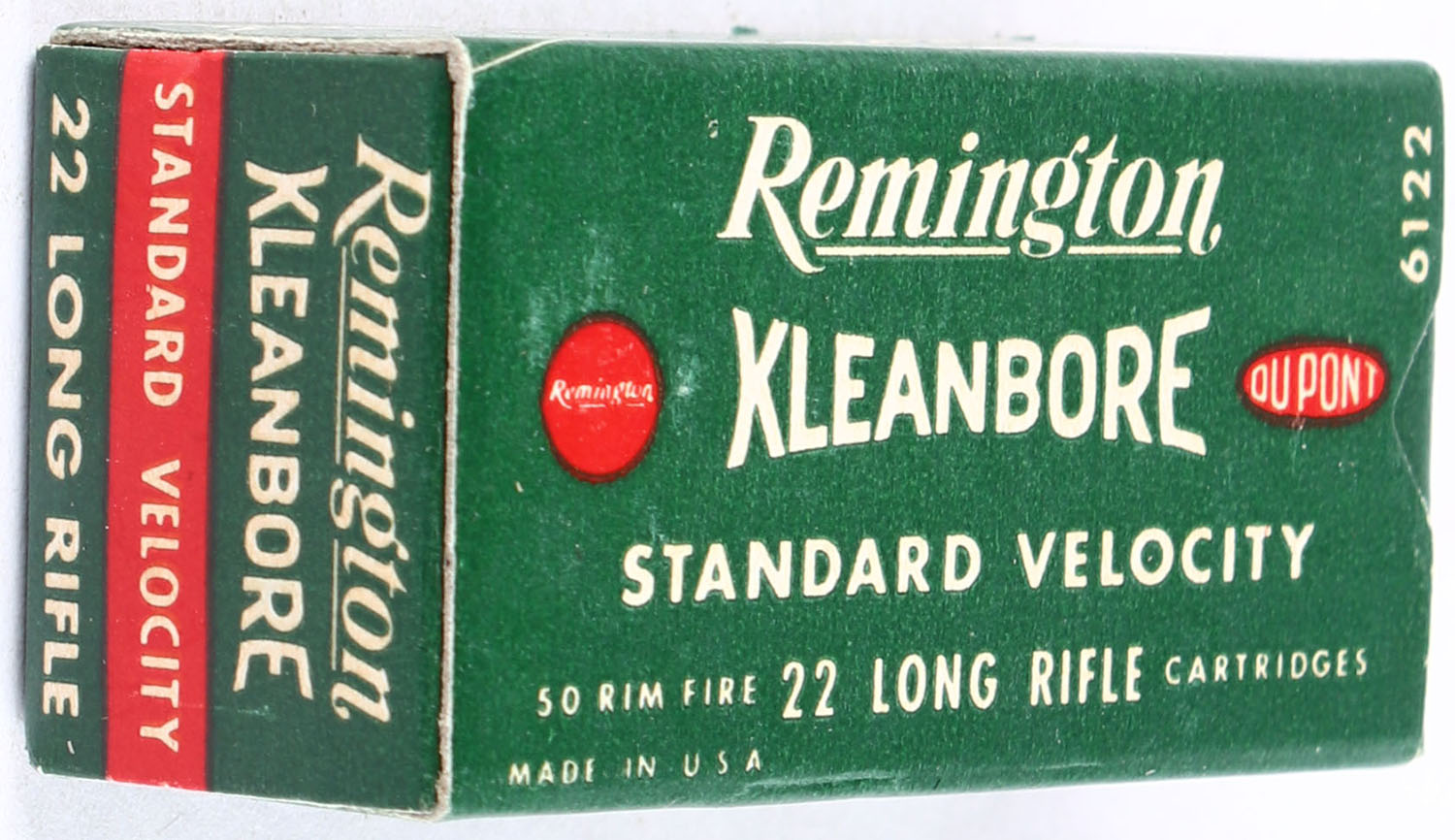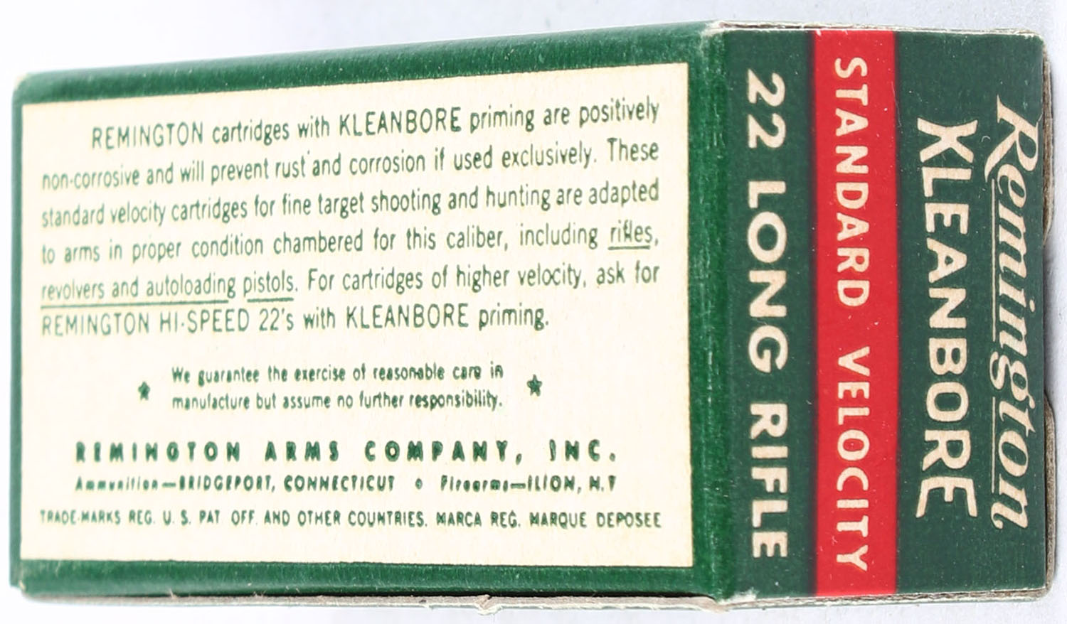 Remington, Kleanbore Standard Velocity, .22 Long Rifle, RHWeb: REM-12 LR-1a, Full, 1pc. Green white & red box, box is solid with excellent color, very minor corner wear, edges are crisp, end flaps are solid, ammo is excellent to minty. Grade: Excellent ++ - Value: 12 to 18