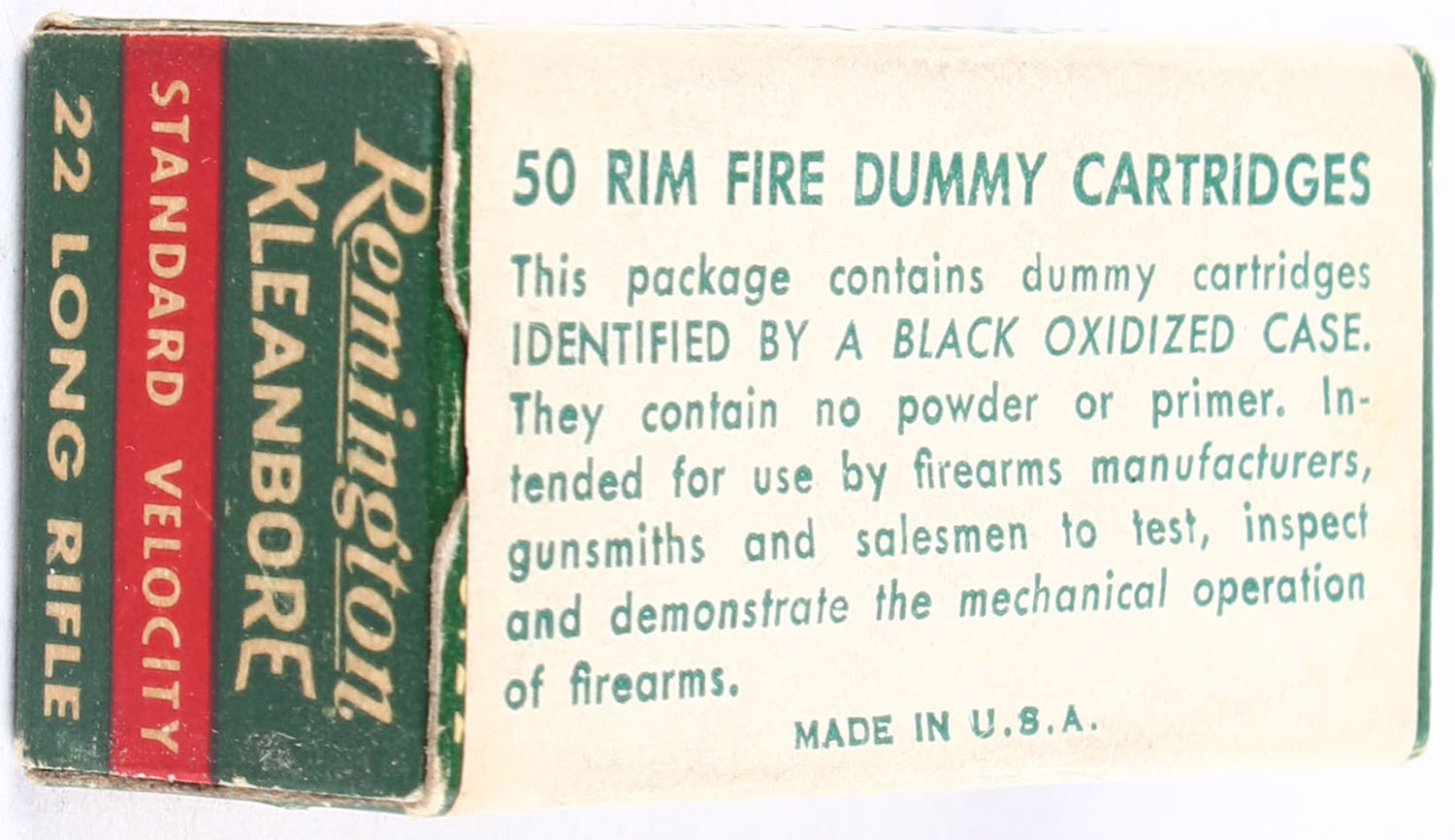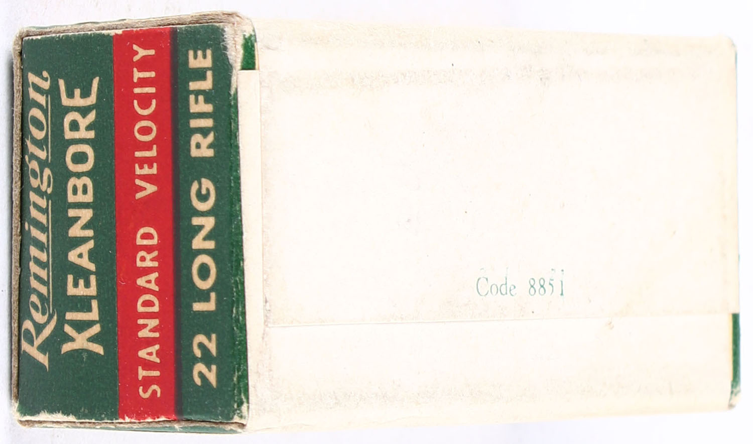 Remington, Kleanbore Standard Velocity, .22 Long Rifle, RHWeb: REM-12 LR-4, Full, 1pc. Green white & red box with white & green full wrap label, box is solid with excellent color, very minor shelf & corner wear, edges are mostly crisp, end flaps are solid, ammo is excellent. Grade: Excellent + - Value: 12 to 18