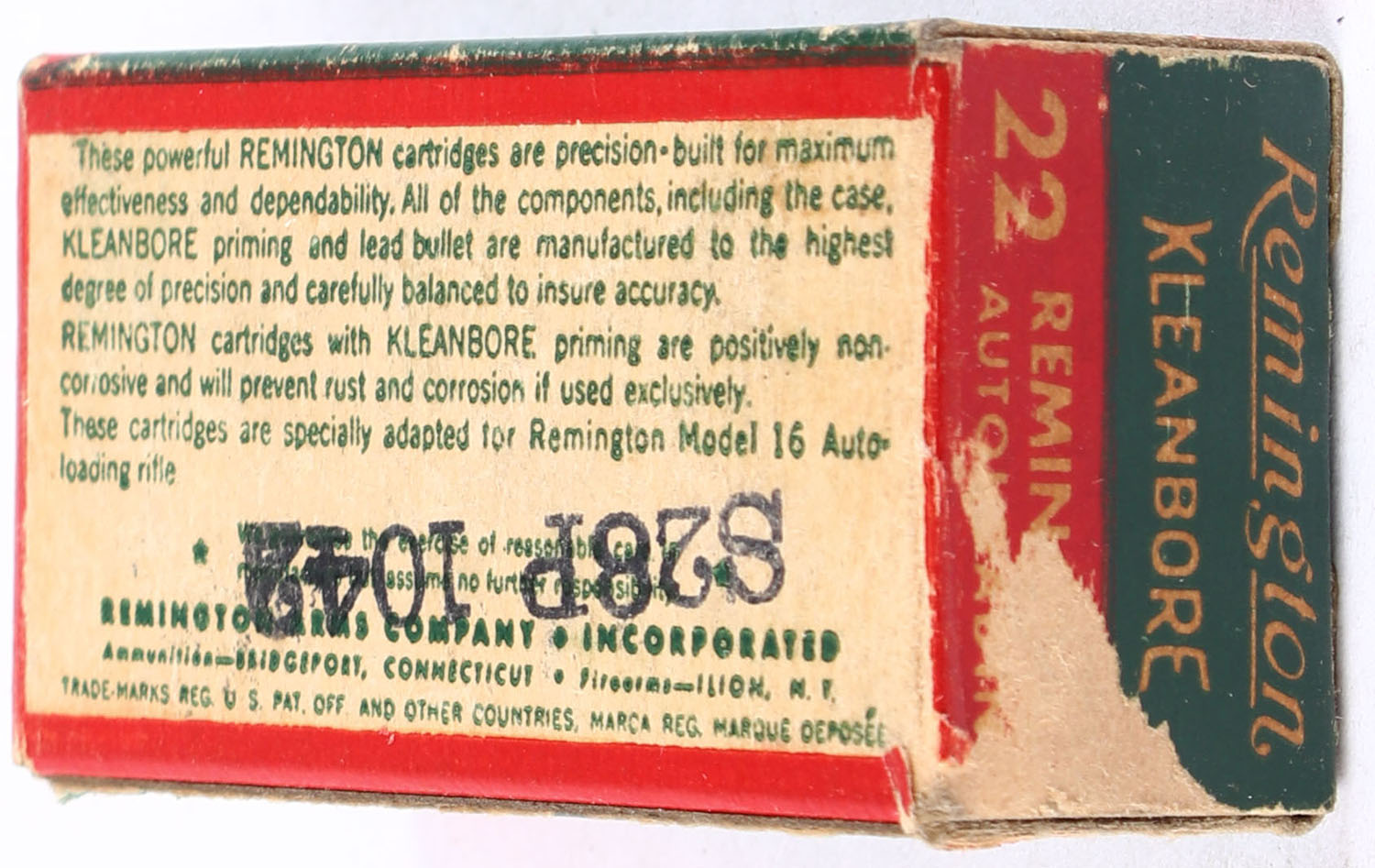 Remington, Kleanbore, .22 Remington Autoloading, RHWeb: REM-12 RA-1b, Full, 1pc. Green white & red box, box is solid with very good color, some age soiling & corner wear, edges are mostly crisp, end flaps are solid, ammo is excellent. Grade: Very Good ++ - Value: 80 to 120