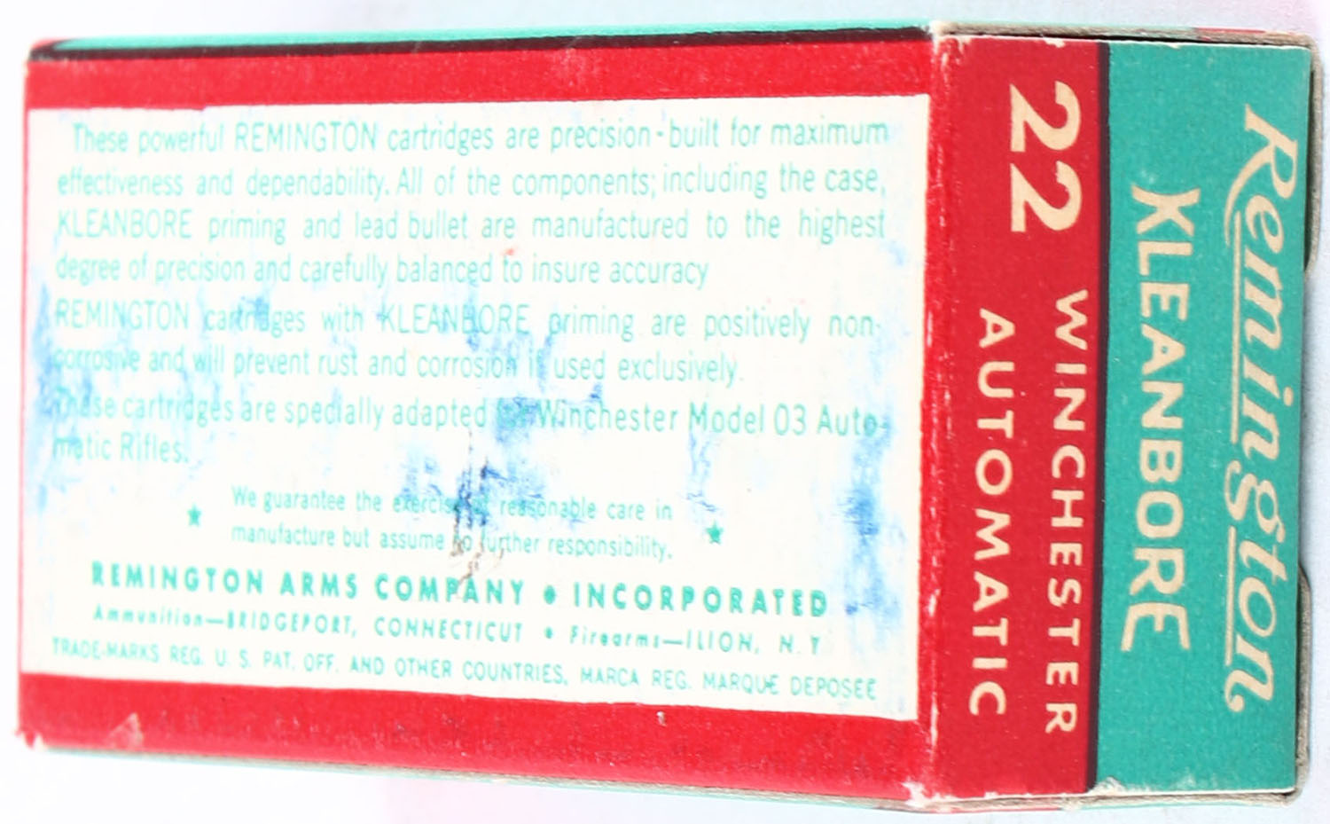 Remington, Kleanbore, .22 Winchester Automatic, RHWeb: REM-16 WA-1, Full, 1pc. Green white & red box, box is solid with excellent to minty color, very minor shelf wear, corners are sharp, edges are crisp, end flaps are solid, ammo is minty. Grade: Excellent ++ - Value: 30 to 45