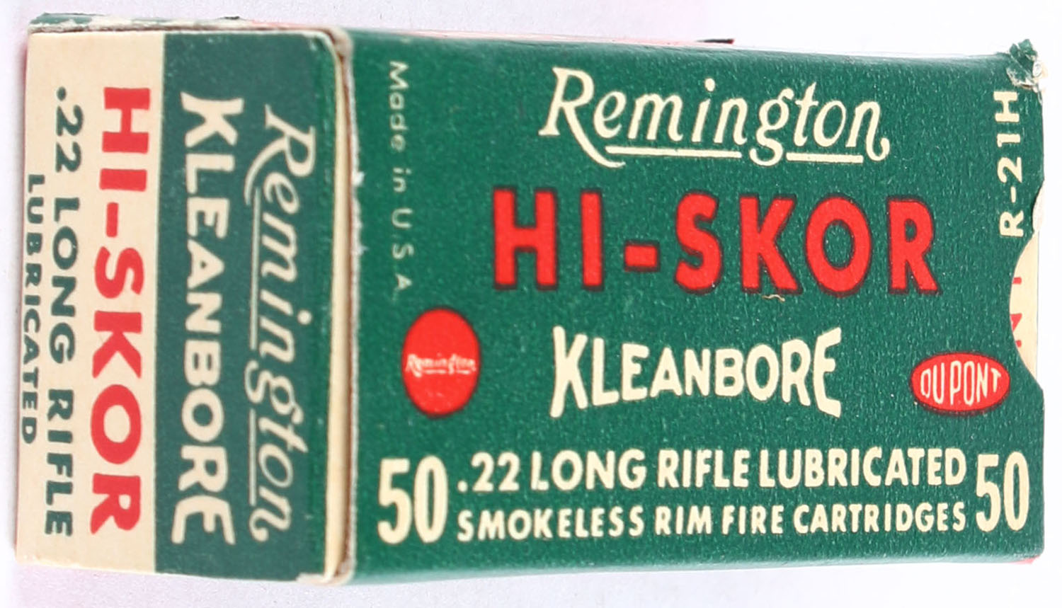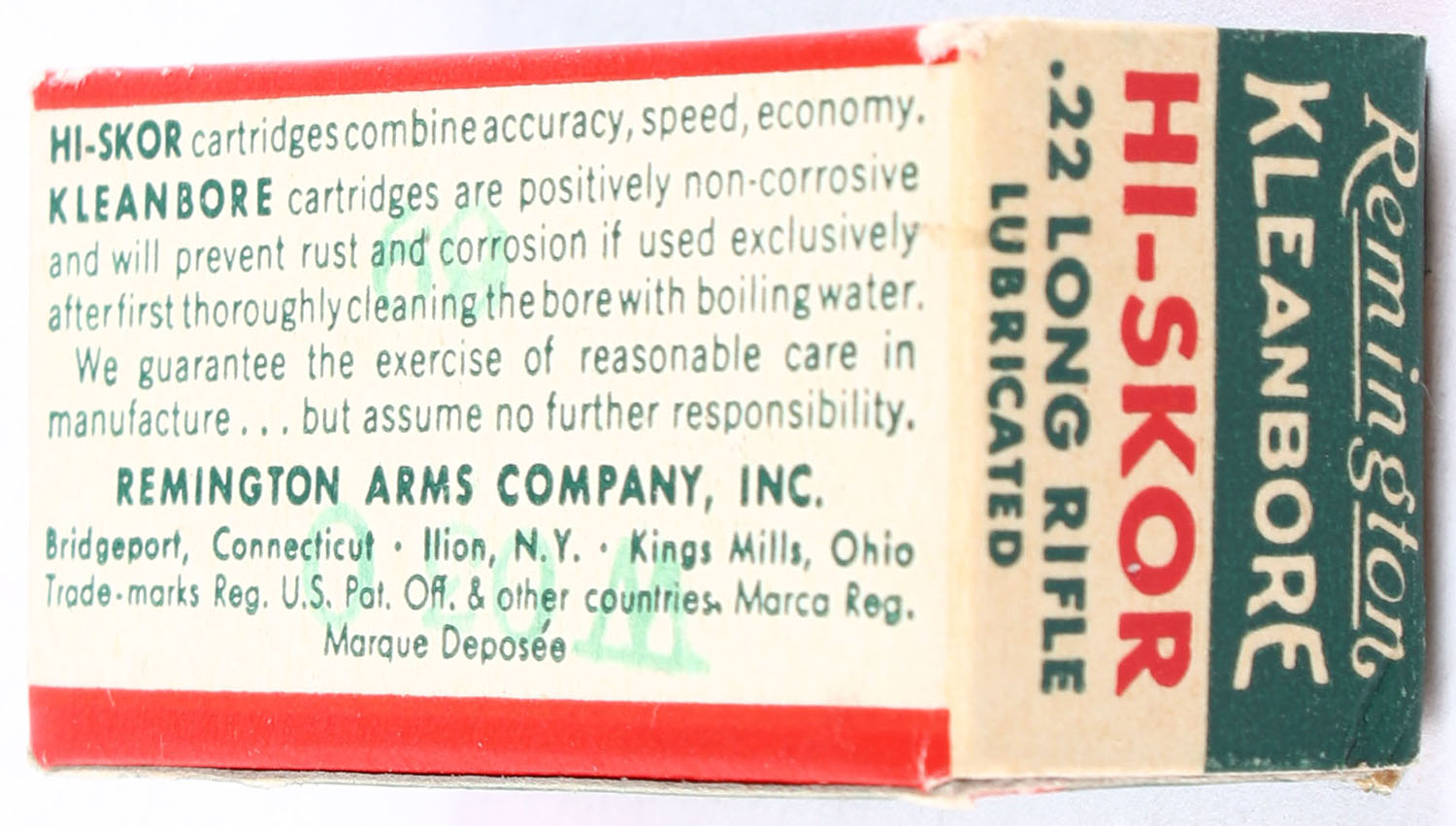 Remington, Hi-Skor, .22 Long Rifle, Kleanbore, RHWeb: REM-53 LR-1b, Full, 1pc. Green white & red box, box is near mint with minty color, only very minor corner wear, edges are crisp, end flaps are solid, ammo is excellent. Grade: Excellent ++ - Value: 50 to 75