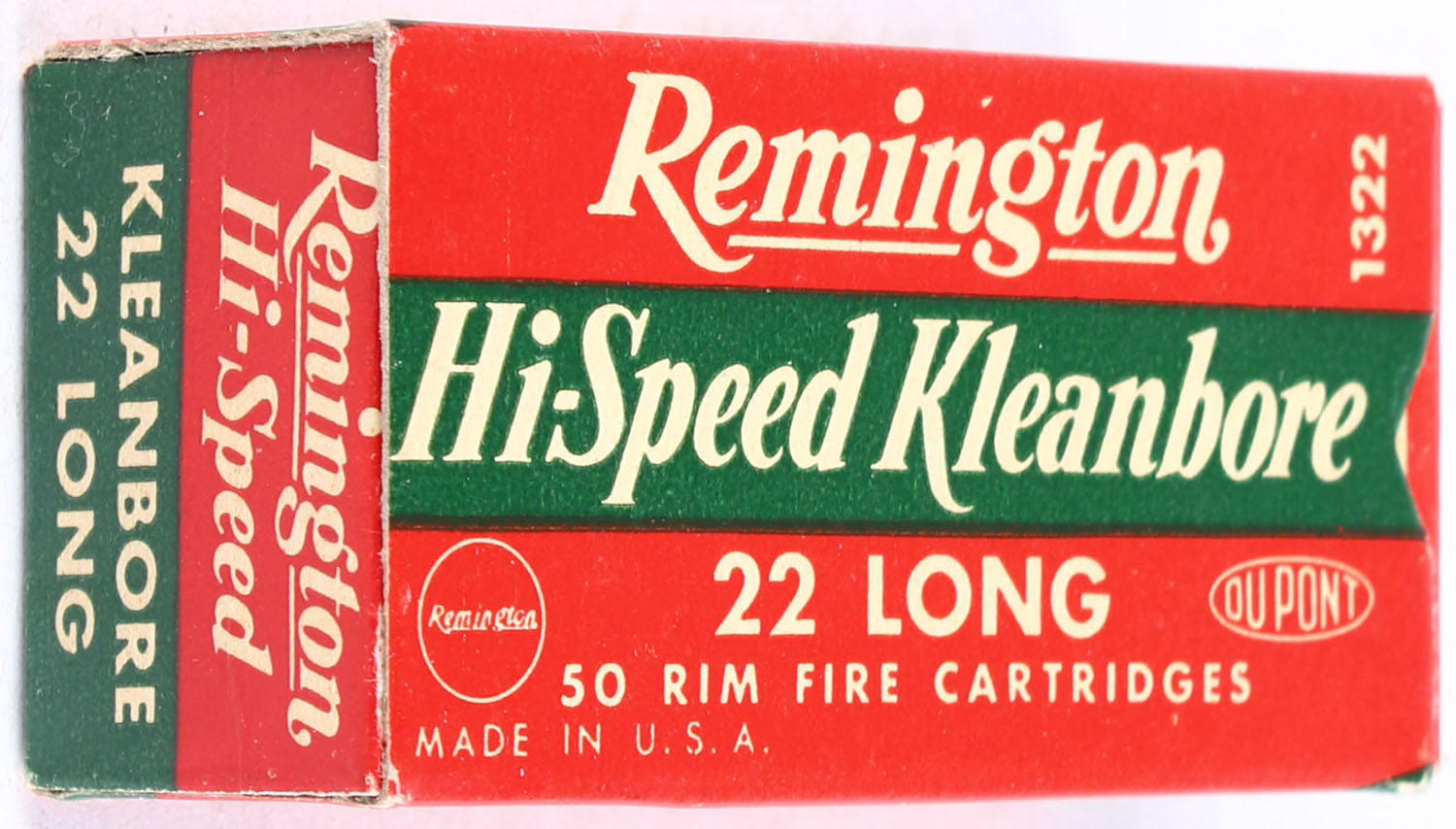 Remington, Hi-Speed Kleanbore, .22 Long, RHWeb: REM-14 L-1b, Full, 1pc. Red white & green box, box is near mint with minty color, only very minor corner wear, edges are crisp, end flaps are solid, ammo is minty. Grade: Excellent ++ - Value: 16 to 24