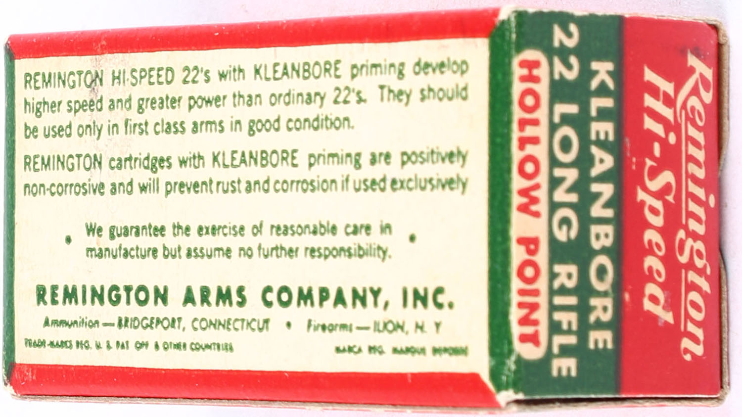 Remington, Hi-Speed Kleanbore, .22 Long Rifle Hollow Point, RHWeb: REM-14 LR-4c, Full, 1pc. Red white & green box, box is solid with excellent very minor age soiling & corner wear, edges are crisp, end flaps are solid, ammo is minty. Grade: Excellent ++ - Value: 20 to 30