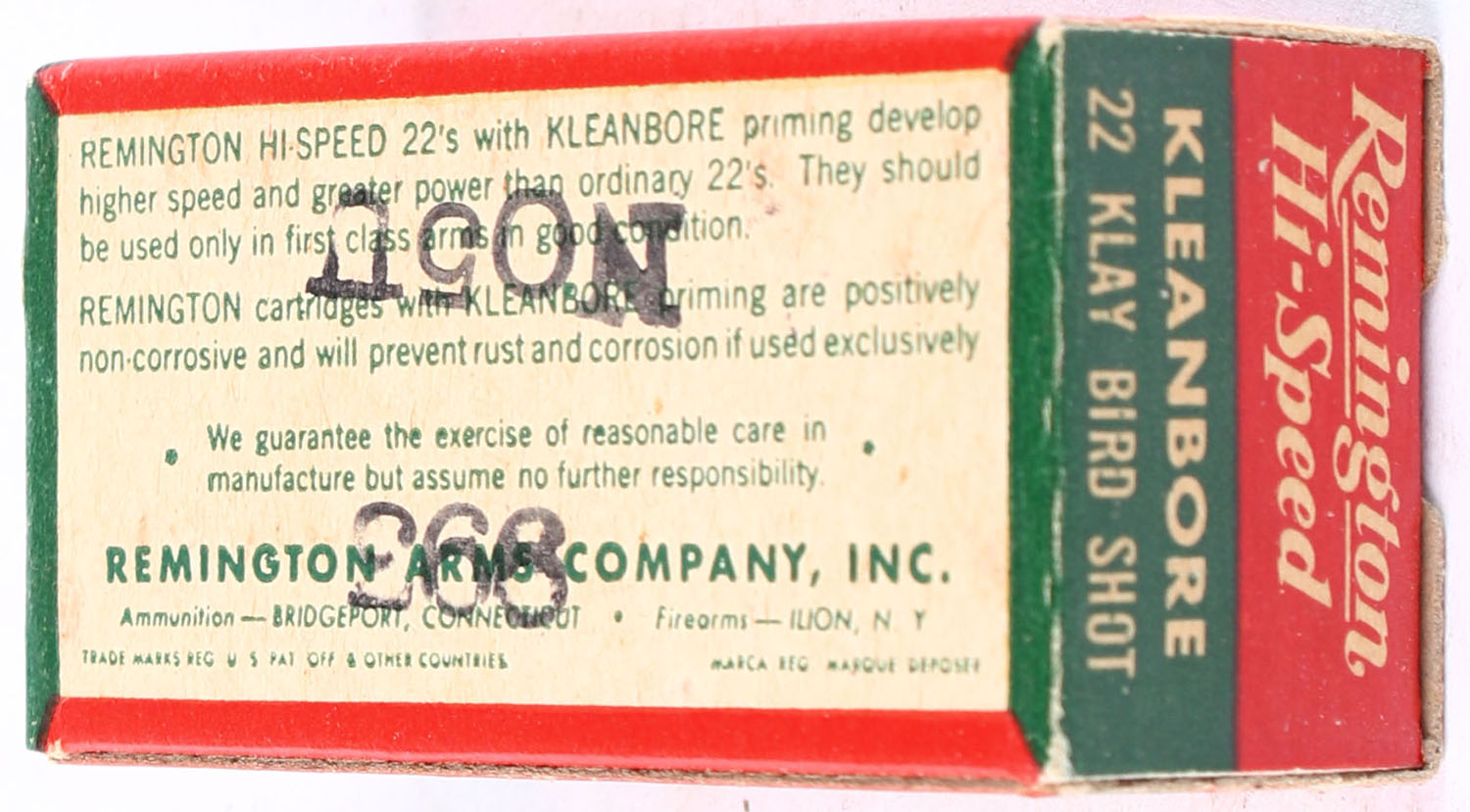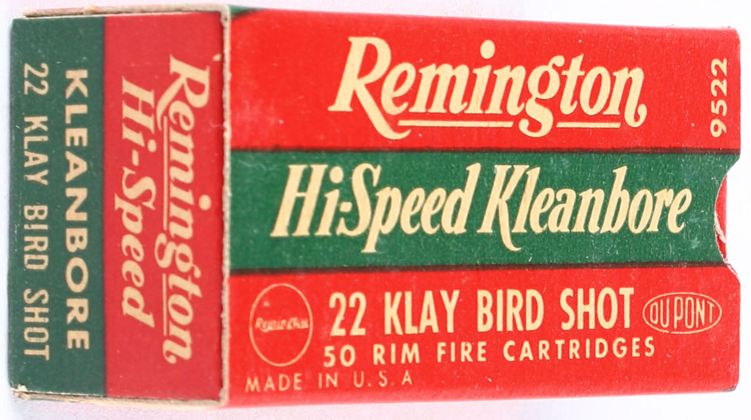 Remington, Hi-Speed Kleanbore, .22 Klay Bird Shot, RHWeb: REM-14 LR-7 Full, 1pc. Red white & green box, box is solid with excellent color, minor age soiling, corners are mostly sharp, edges are crisp, end flaps are solid, ammo is minty. Grade: Excellent ++ - Value: 150 to 225