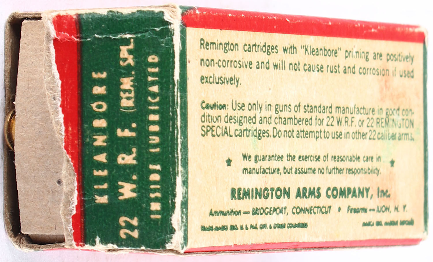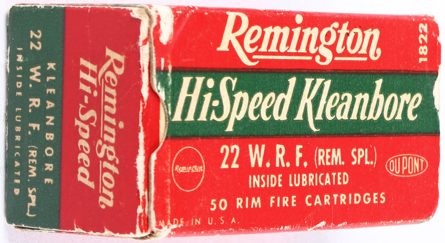 Remington, Hi-Speed Kleanbore, .22 W.R.F. (Rem. Spl.), RHWeb: REM-14 WRF-1c, Full, 1pc. red green & buff box, box has a partially torn end flap otherwise solid, minor edge & corner wear, ammo is excellent. Grade:Very Good - Value: 10 to 30