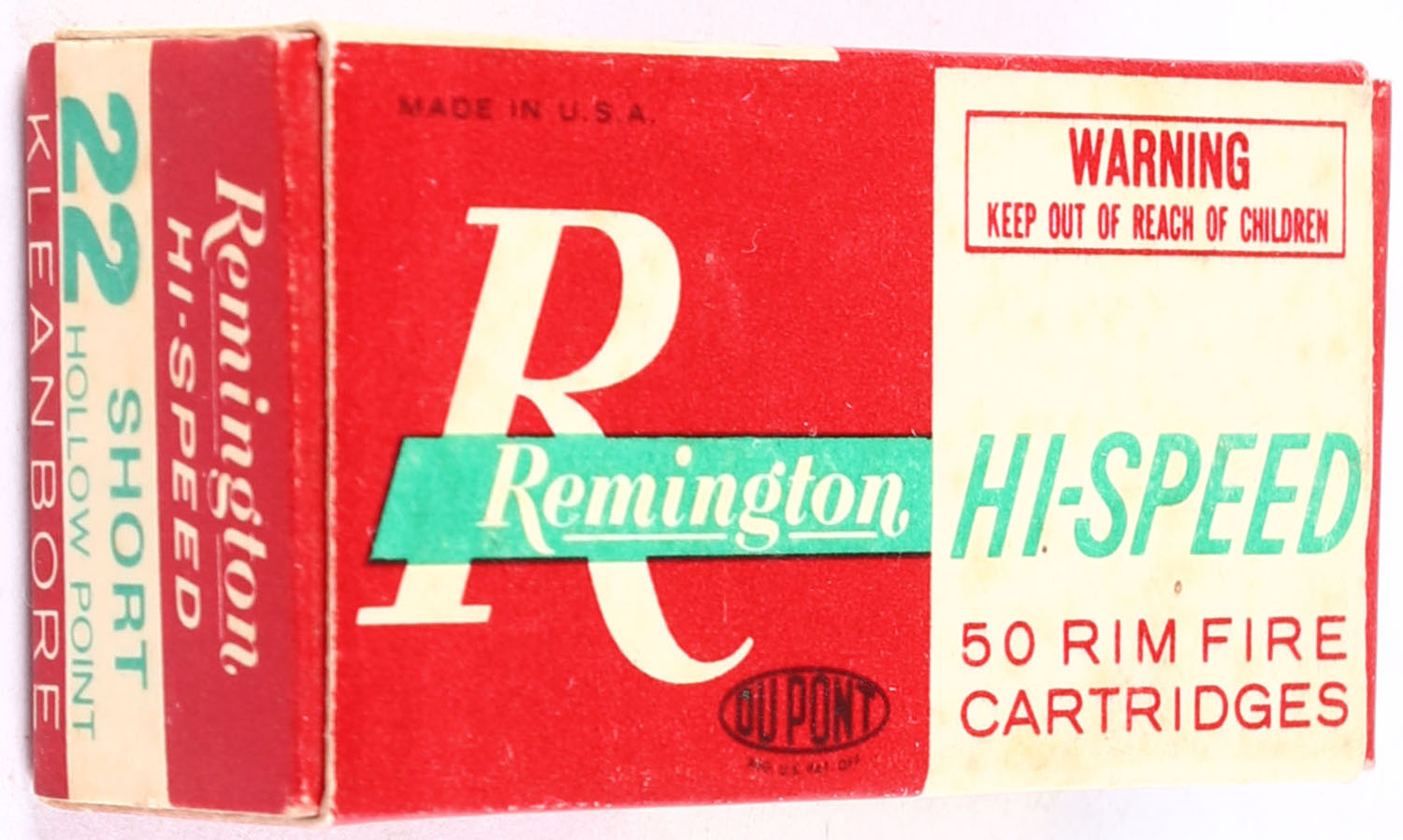 Remington, Hi-Speed, .22 Short Hollow Point, ''Golden'' Bullet, Full, 1pc. red white & green box, box is solid with excellent color, very minor age soiling & corner wear, edges are crisp, end flaps are solid, ammo is excellent. Grade: Excellent - Value: 8 to 15