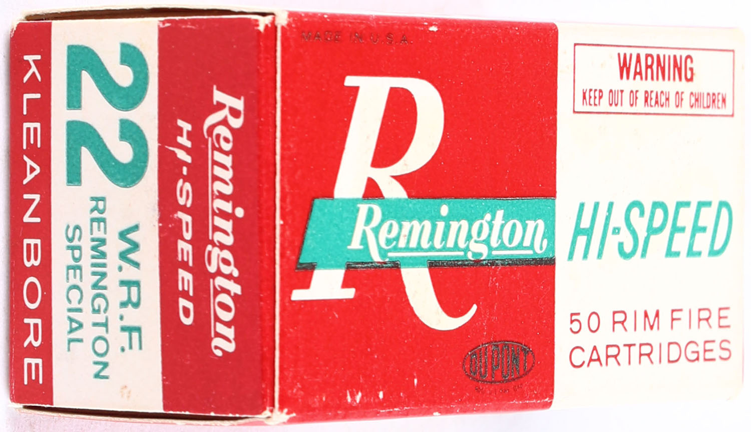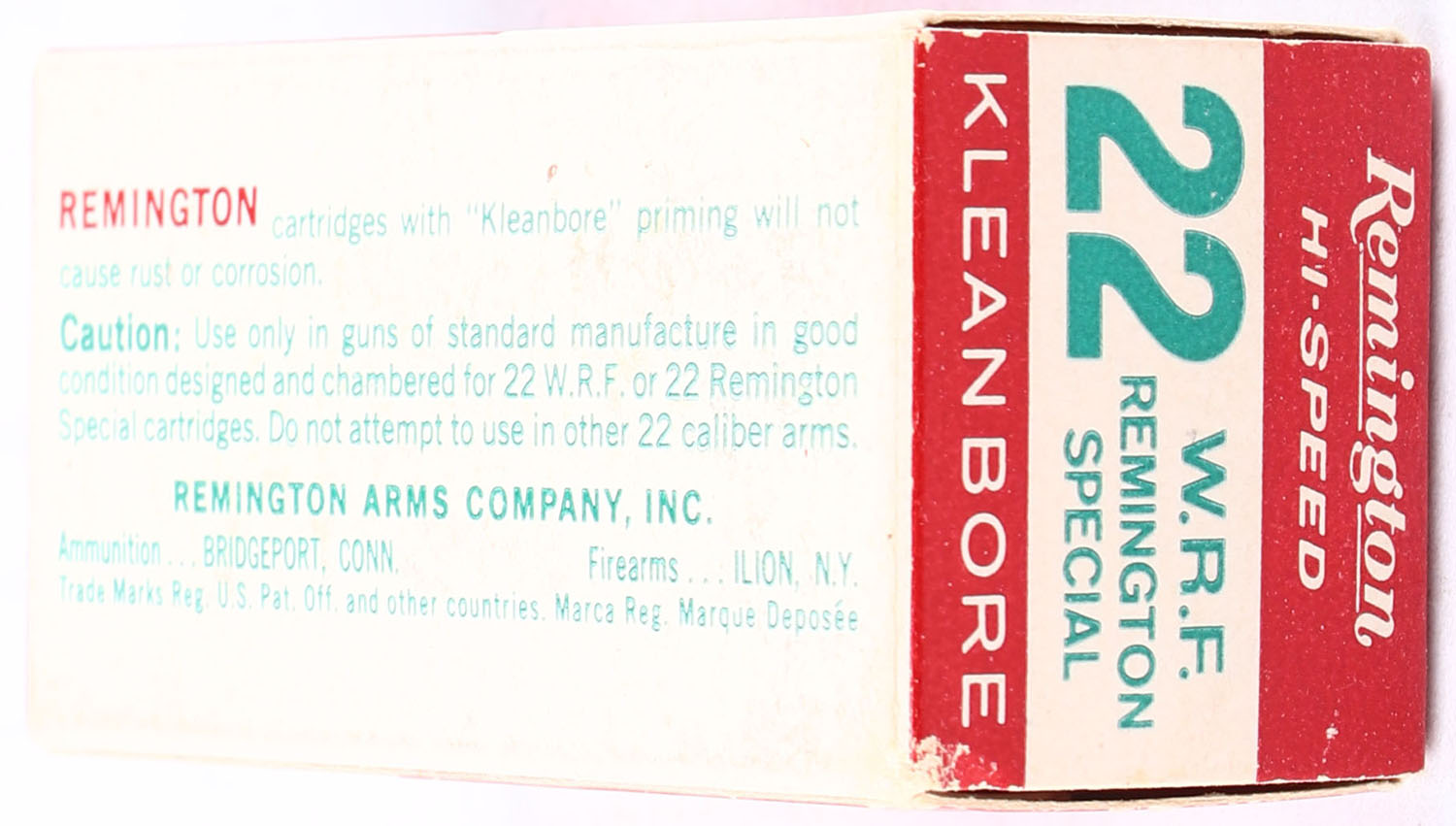 Remington, Hi-Speed, .22 W.R.F. Remington Special, Full, 1pc. red white & green box, box is solid with excellent color, very minor age soiling & corner wear, edges are crisp, end flaps are solid, ammo is excellent. Grade: Excellent + - Value: 10 to 50