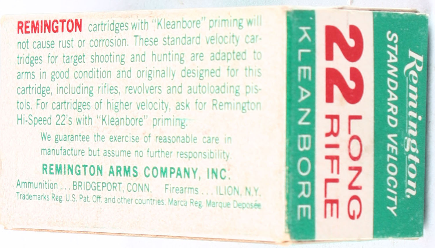 Remington, Standard Velocity, .22 Long Rifle, Kleanbore, Full, 1pc. Green white & red box, box is solid with excellent color, very minor shelf & corner wear, edges are crisp, end flaps are solid, ammo is excellent. Grade: Excellent - Value: 8 to 15