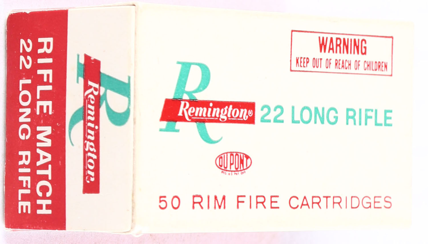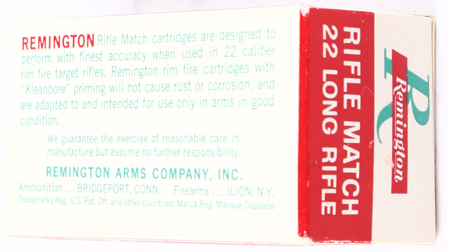 Remington, Rifle Match, .22 Long Rifle, Full, 1pc., white red & green box with ''Reclassified'' over-stamp, box is solid with minty color, some corner wear, edges are crisp, end flaps are solid, ammo is minty. Grade: Excellent + - Value: 8 to 15