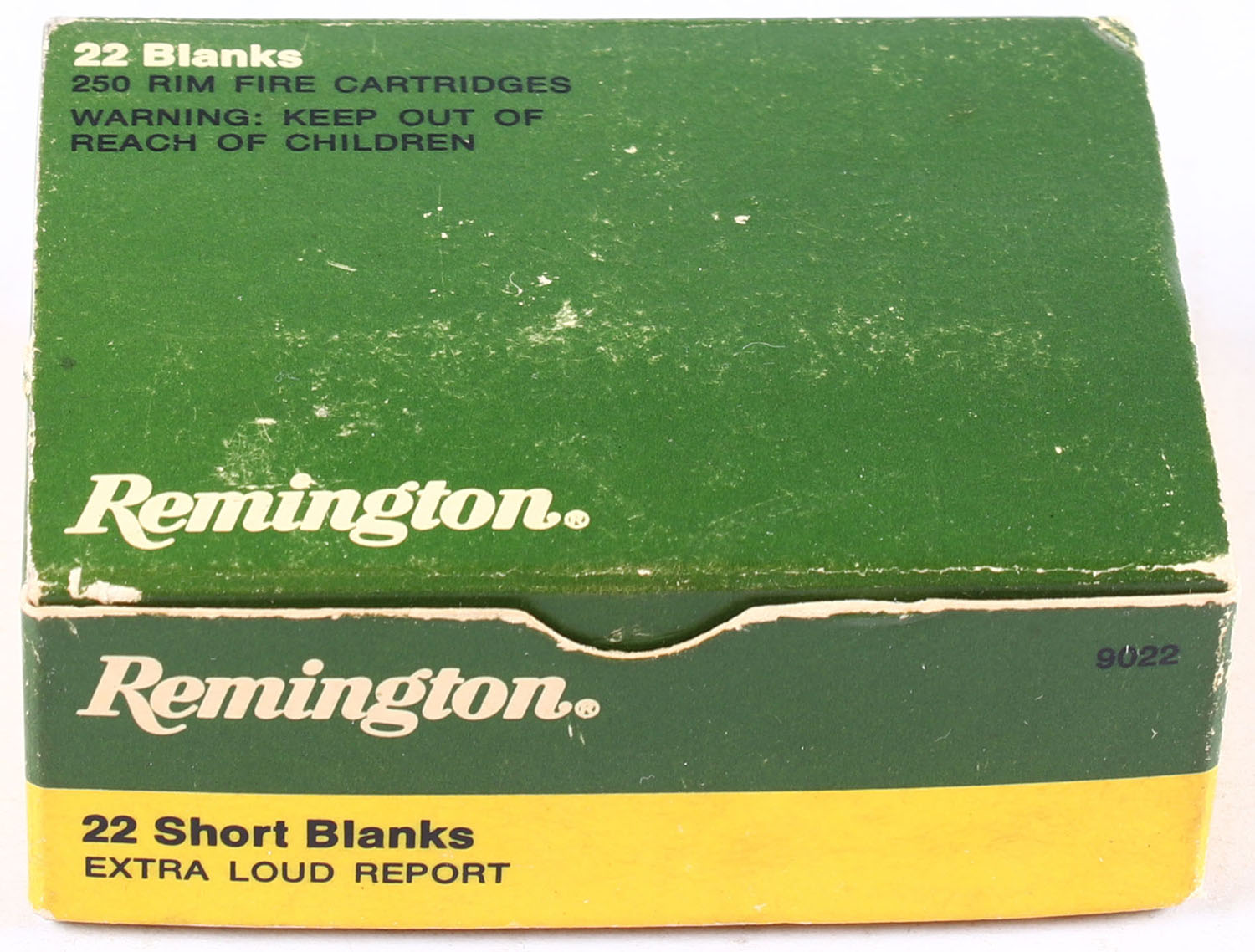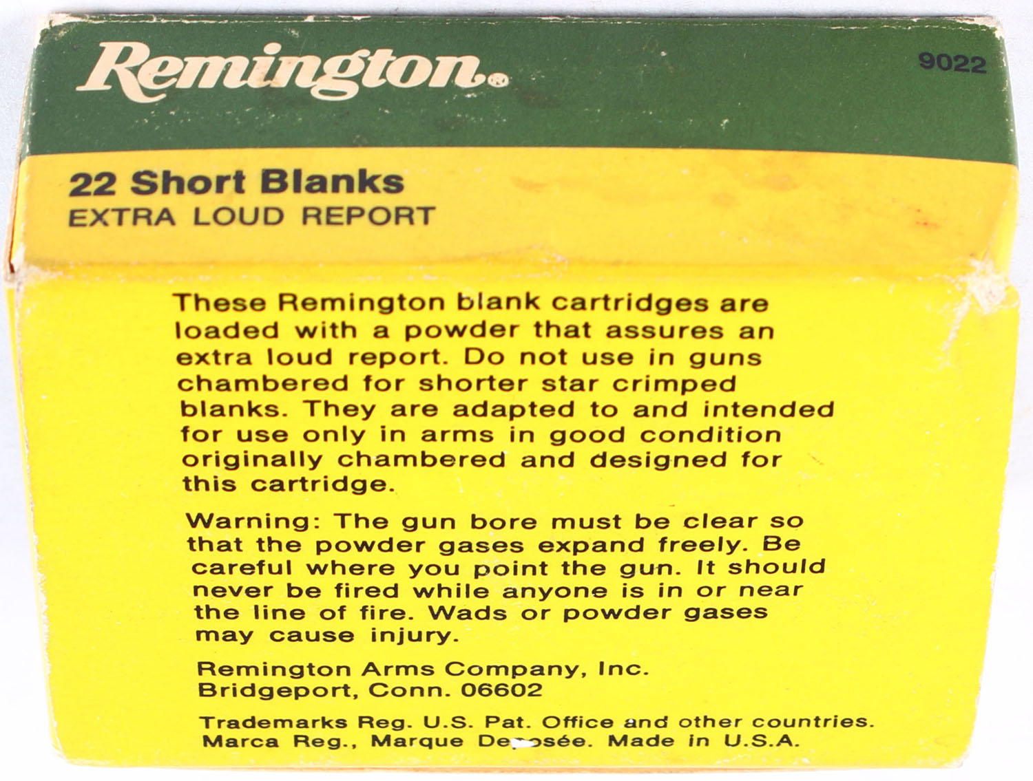 Remington, .22 Short Blanks, Extra Loud Report, Full, 1pc., green, yellow & white box, box is solid with light scuffing, some corner wear, edges are crisp, end flaps are solid, ammo is minty. Grade: Excellent - Value: 16 to 50
