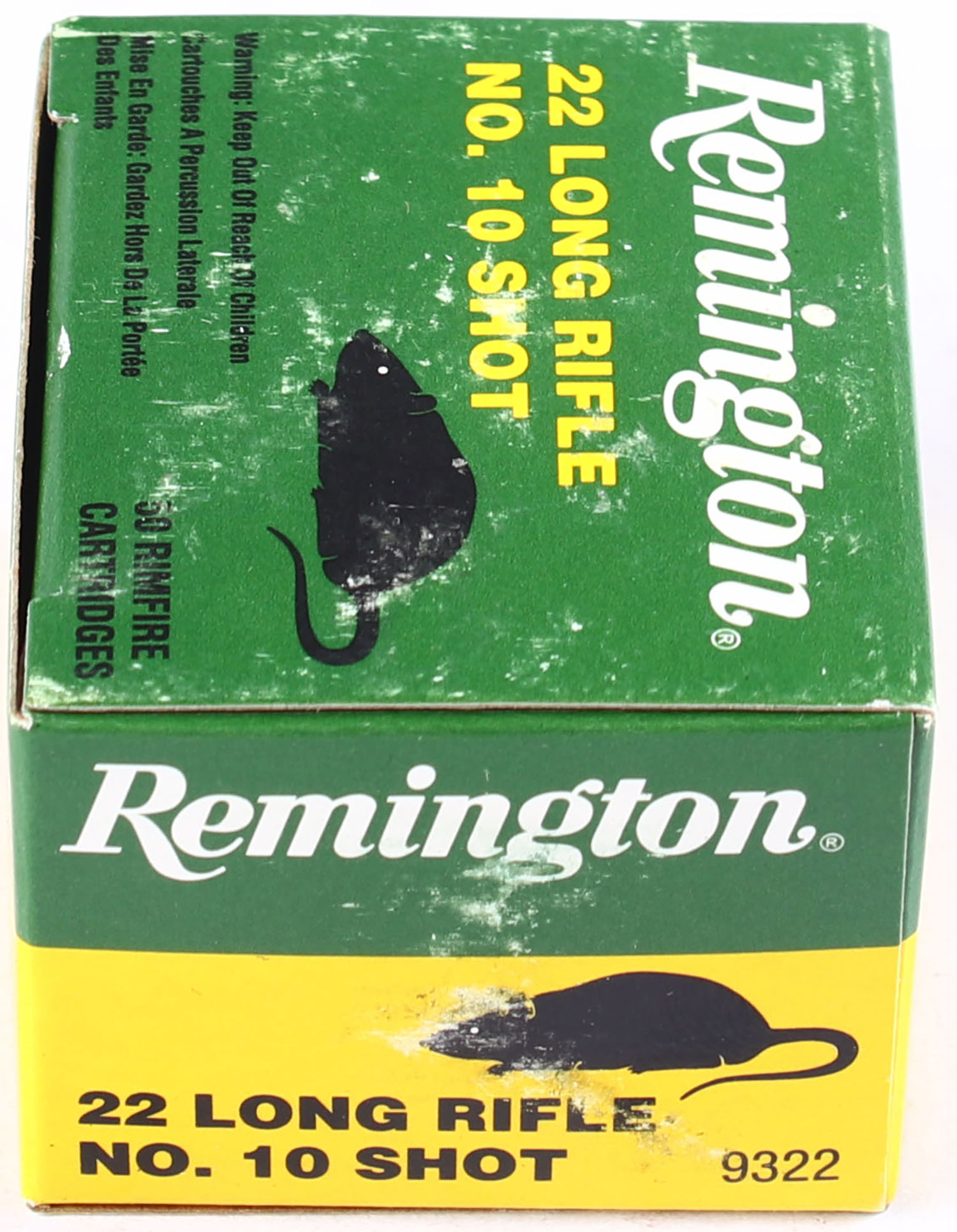 Remington, .22 Long Rifle No. 10 Shot, has rat on two sides, Full, 1pc., green, yellow & white box, box is solid with light scuffing, some corner wear, edges are crisp, end flaps are solid, ammo is minty. Grade: Excellent - Value: 20 to 100