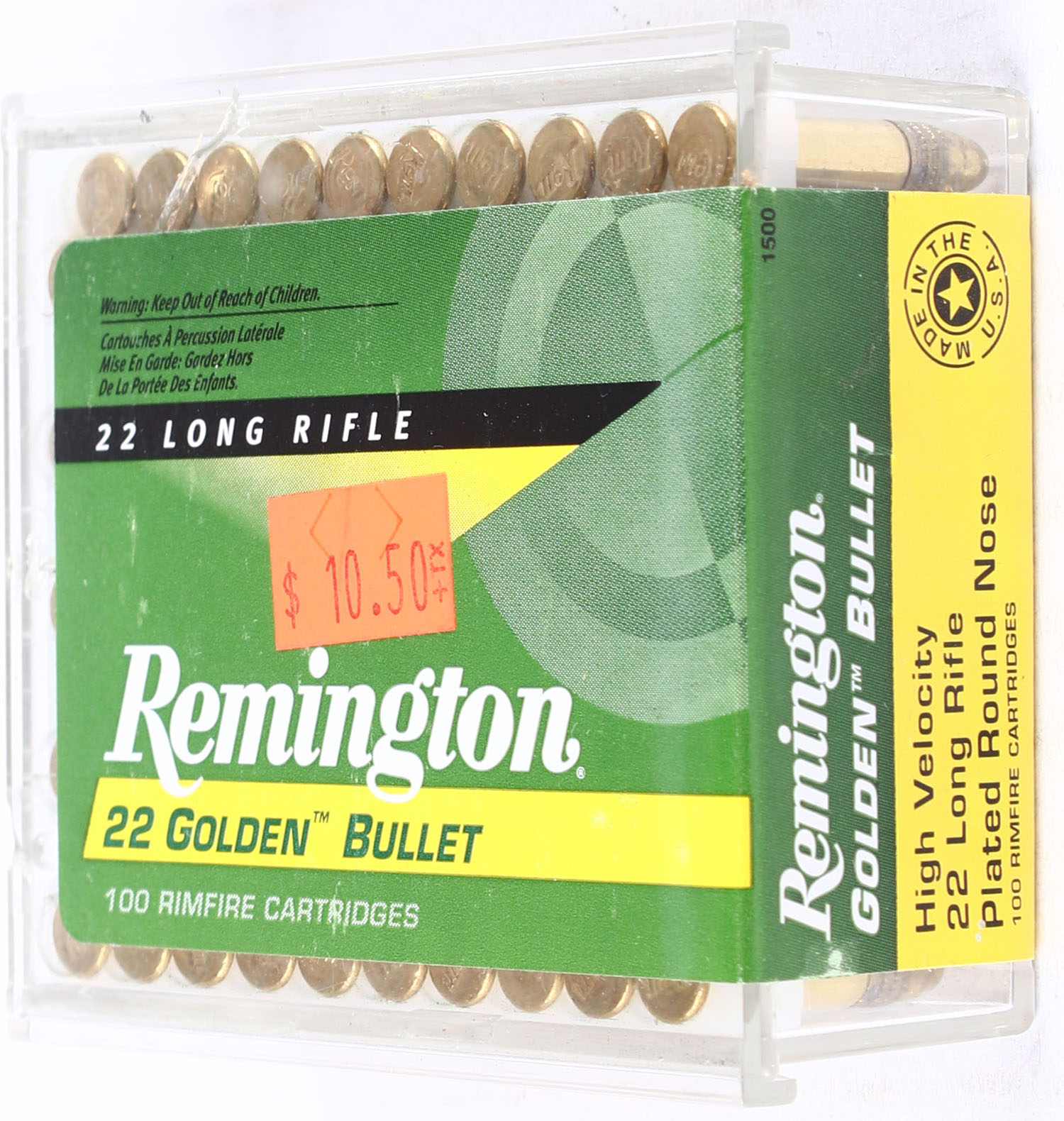 Remington, Golden Bullet, .22 Long Rifle, FULL & SEALED, 2pc. clear plastic tray with green, yellow & black sealing label, box is solid, label is intact with excellent color, ammo appears minty. Grade: MINT - Value: 10 to 40