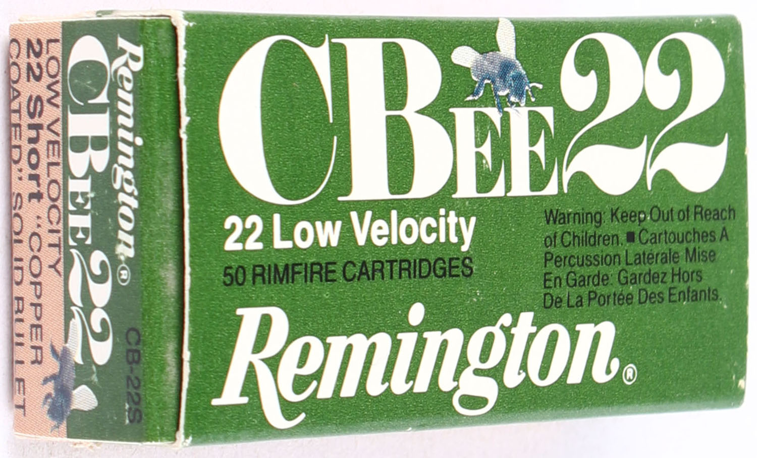 Remington, CBee22, .22 Short Copper Coated Soild Bullet, Low Velocity, Full, 1pc., green, white & brown box, box is near mint with minty color, only very minor corner wear, edges are crisp, end flaps are solid, ammo is minty. Grade: Excellent ++ - Value: 6 to 30