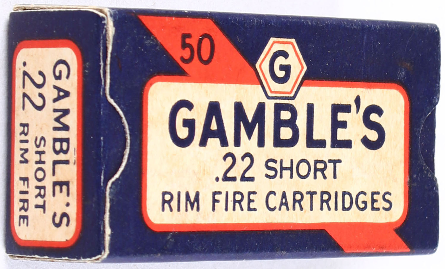 Gambles, Rim Fire Cartridges, .22 Short, RHWeb: GS-1 S-3, Full, 1pc., blue white & red box, box is solid with excellent color, minor age soiling, edges are crisp, end flaps are solid, ammo is near mint. Grade: Excellent ++ - Value: 50 to 250